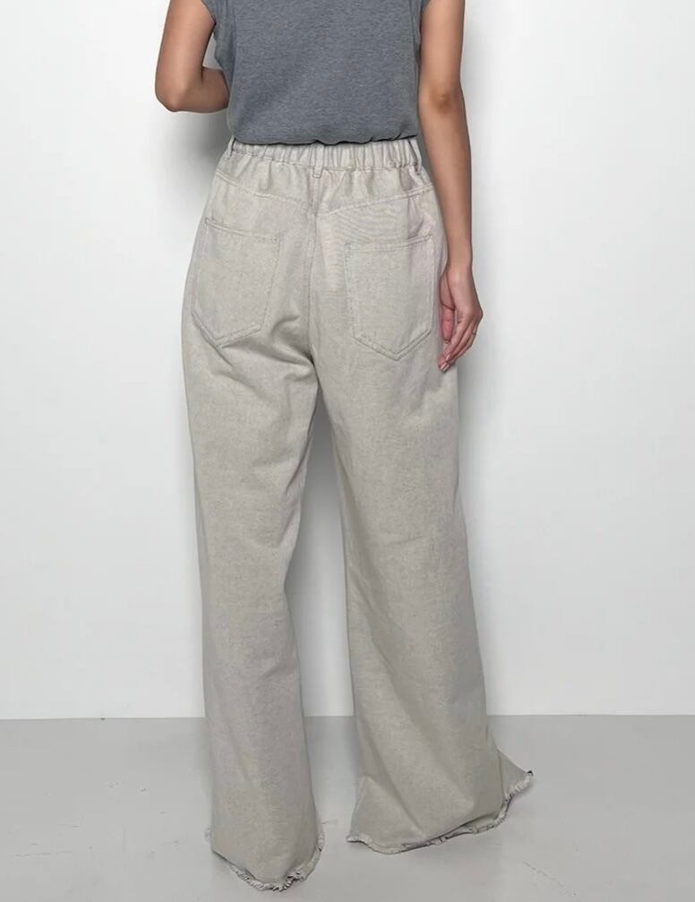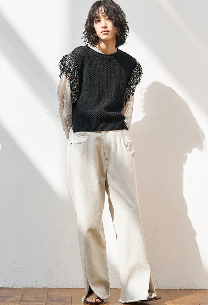24SSで展開したラップアジャストデニムをアップデートしました。フロント部分のラップデザインはそのままに、少しボリュームを抑えたすっきりとしたワイドストレートに変更。前振りにしたサイドラインを活かして裾に深めのスリットを入れました。裾は断ち切りフリンジ仕様にすることで抜け感をプラスしています。後ろウエストはゴム仕様で、フロント部分のラップデザインは、1段階でウエストサイズ調整可能です。白と黒の異なる色をMIXして織られたユニークな表情の生地を使用したWhiteです。サイズ38です。