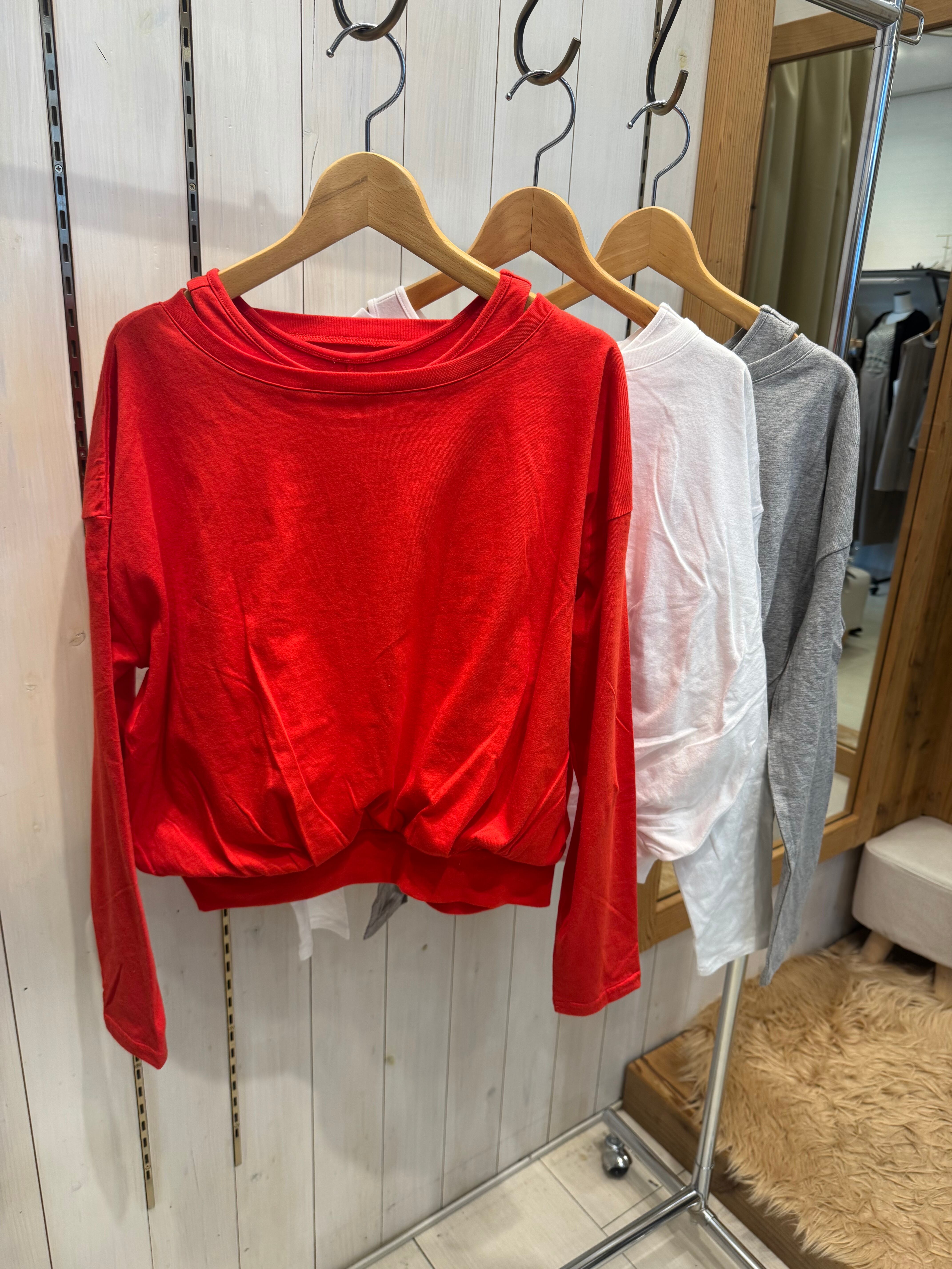 2枚レイヤードしているように見えて裾で1枚になっているレイヤード風のカットソー。