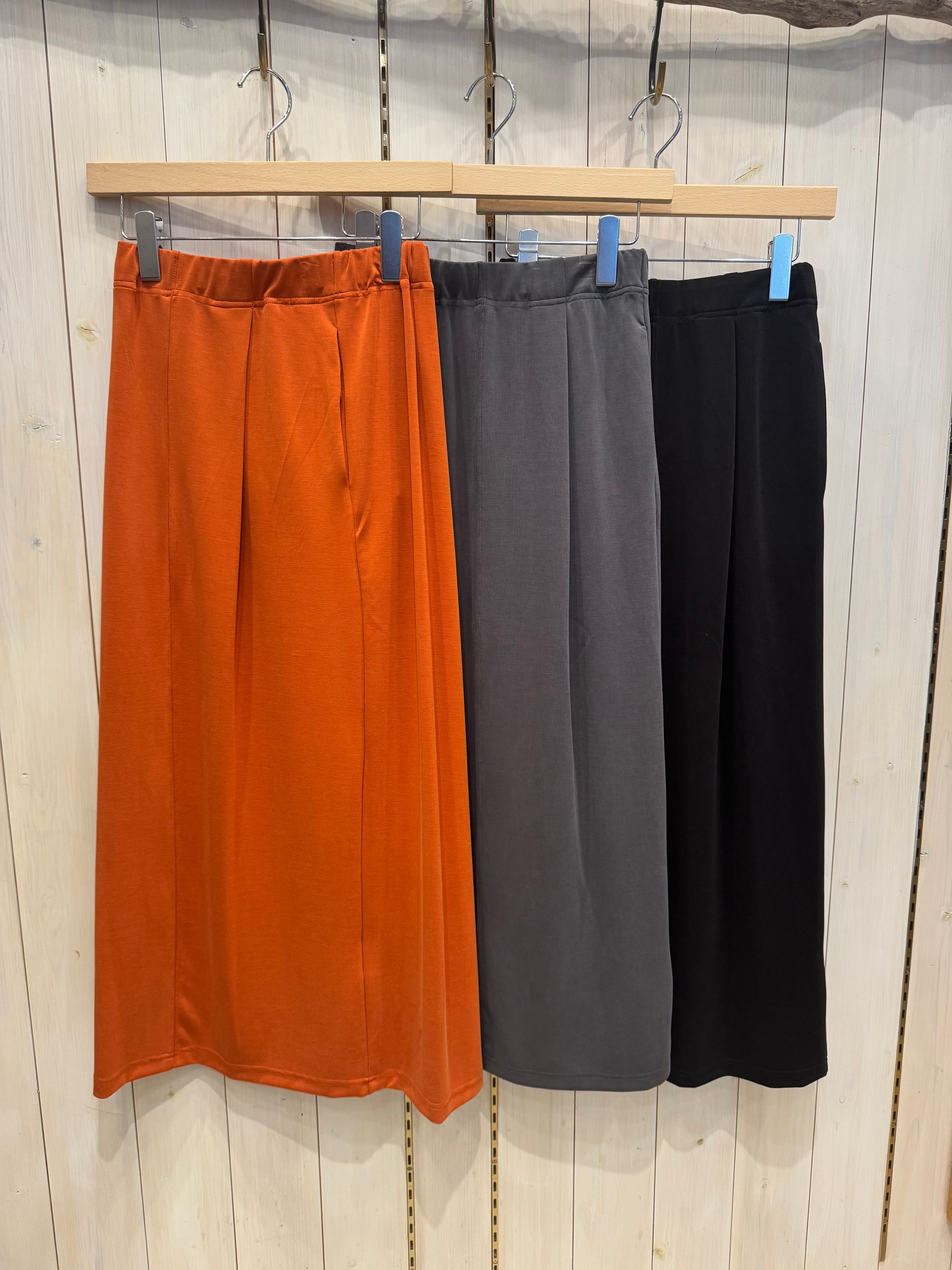 後ろスリットもあるので足さばきもよく、ウエストゴムのイージー仕様で楽に履いていただけます。
