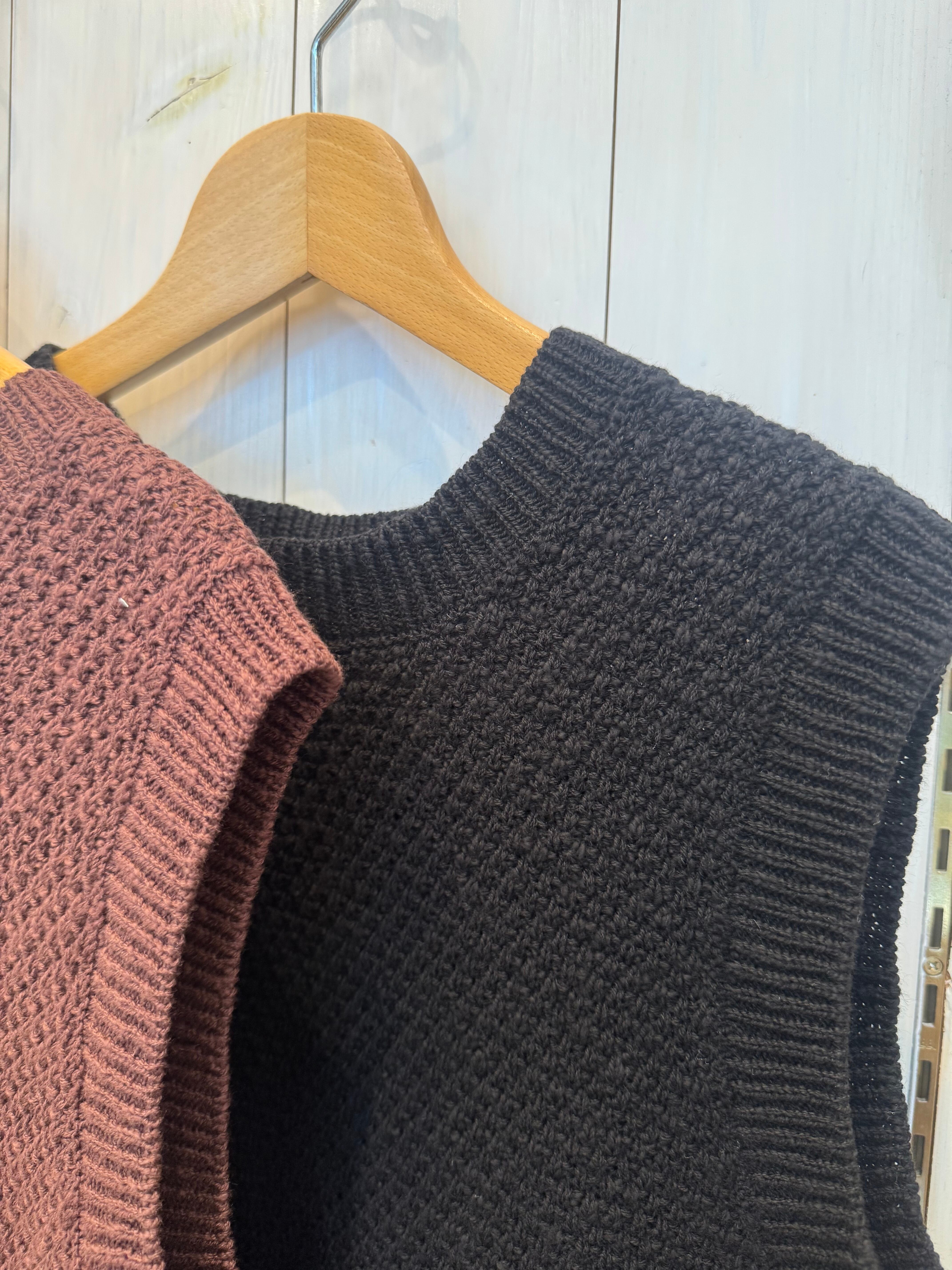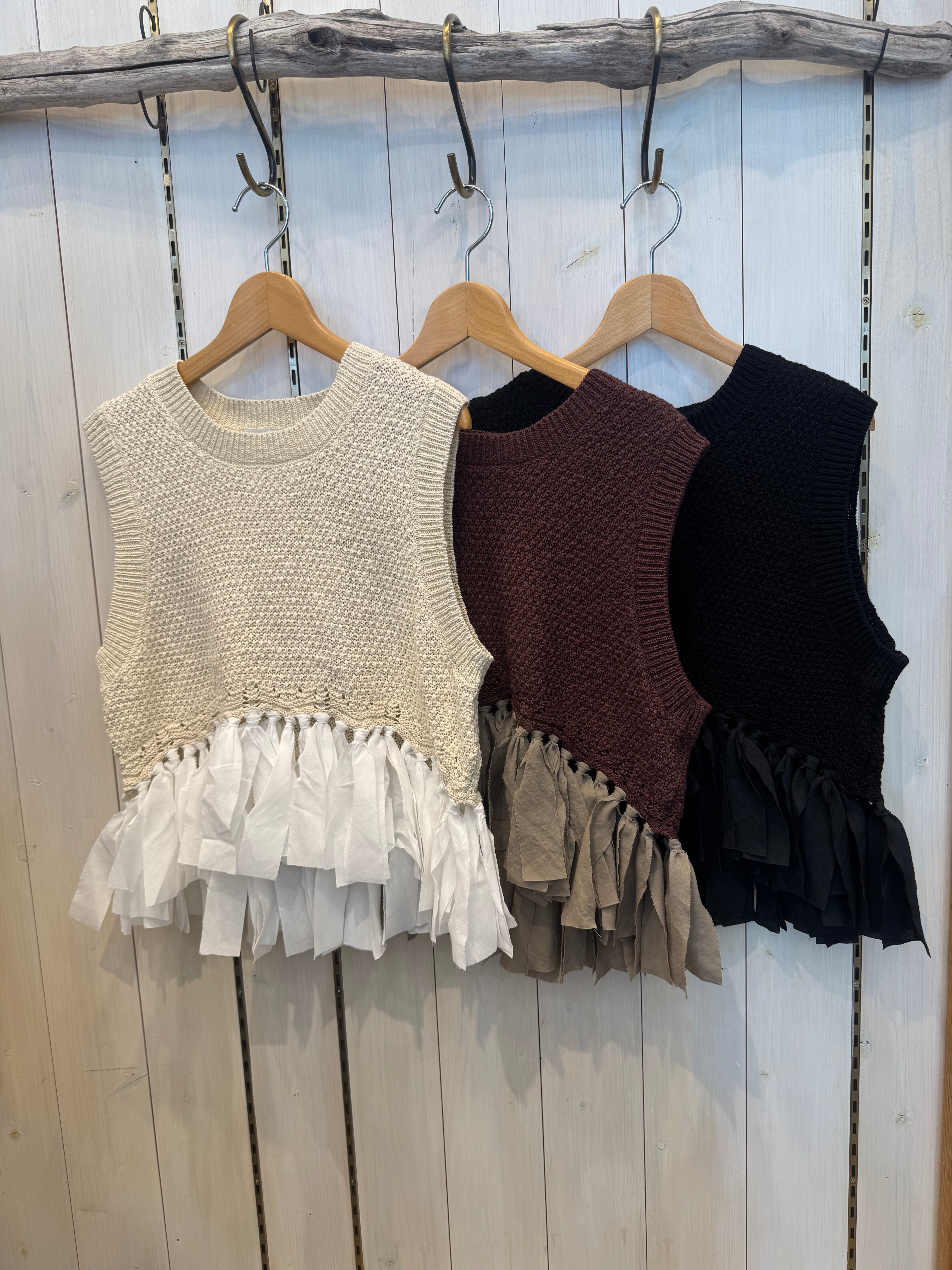 身頃には表情感のあるスラブ綿糸をさらに鹿の子編みで表面を凹凸させ、下部分には軽く柔らかいガーゼのような綿生地をドッキングし変化のあるデザインに。