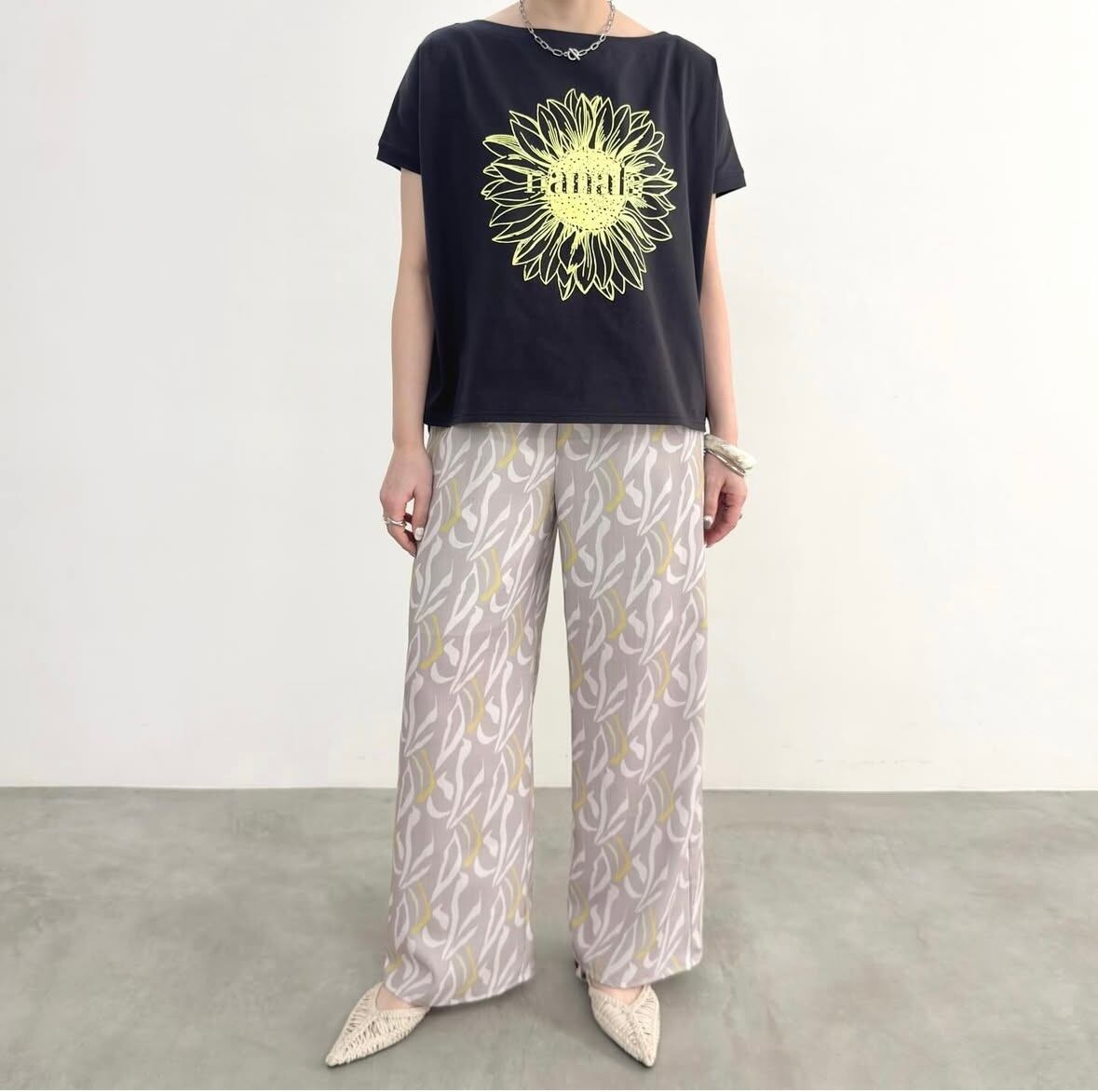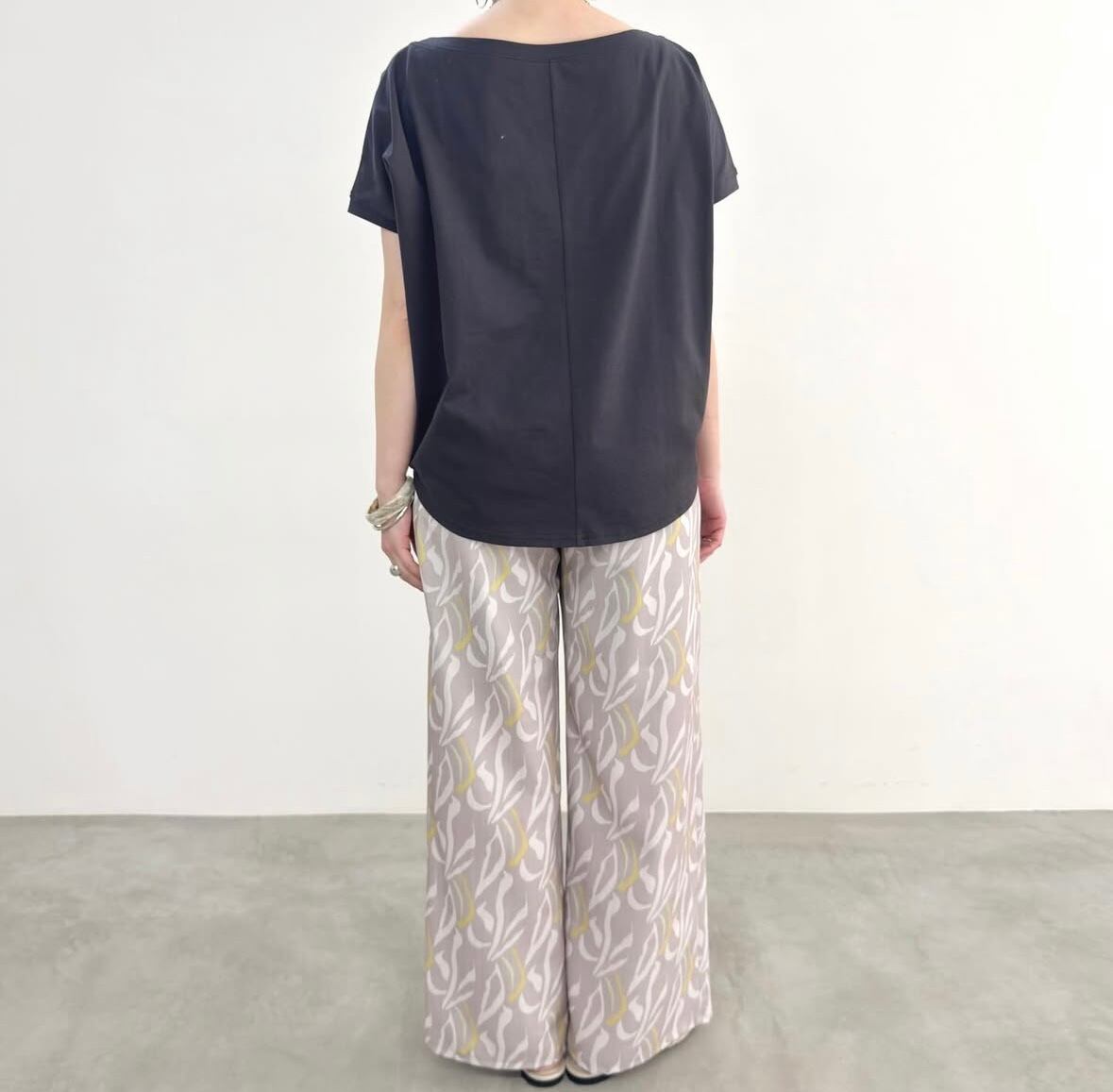 やや広めのボートネックはズラしてワンショルダーとしても◎