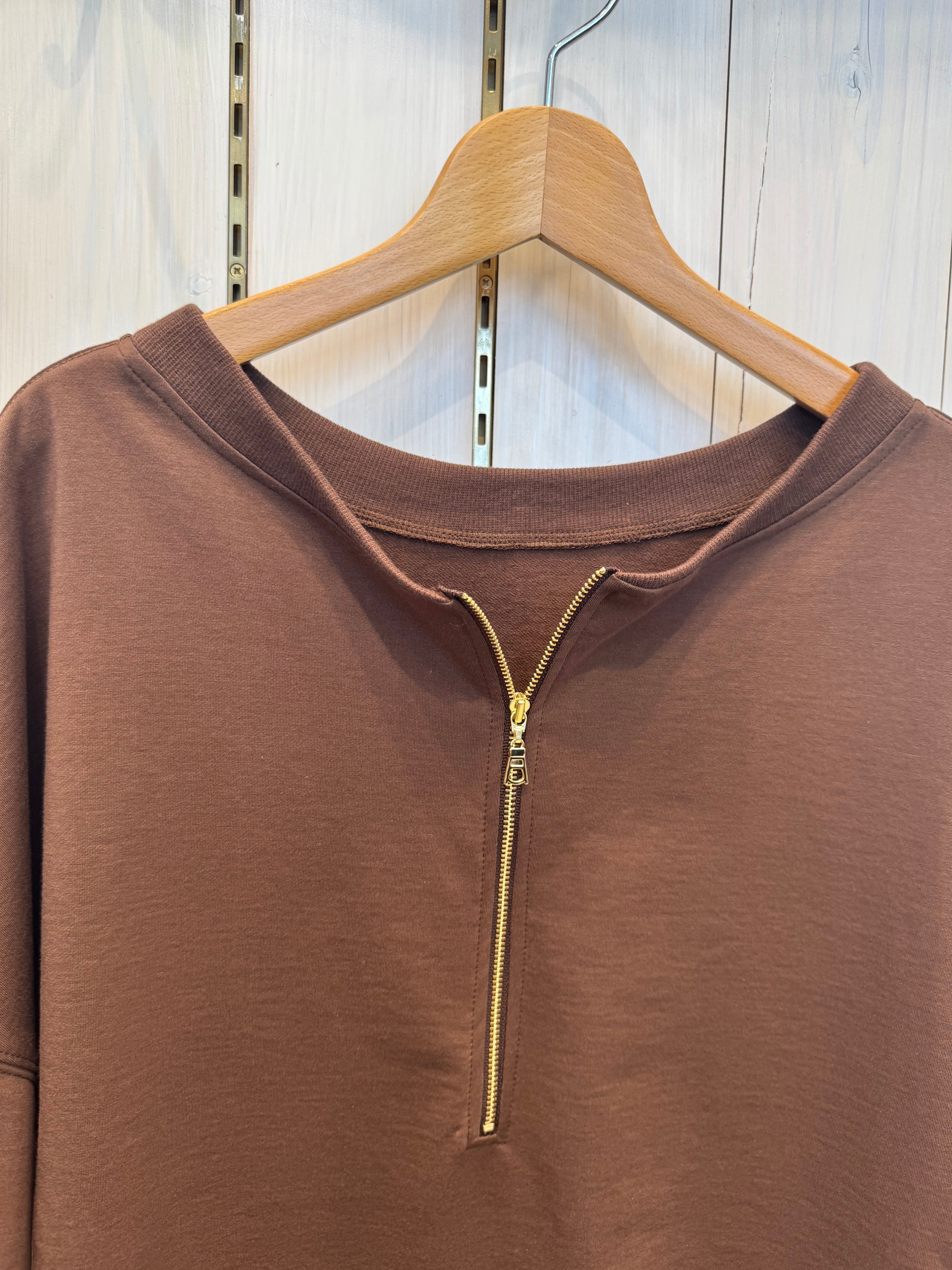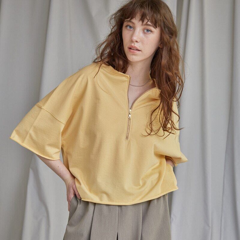 ジップがさりげなく可愛いアクセントになっていて、ボックス型が上半身を動きやすくしているハーフジップボックスTシャツです。