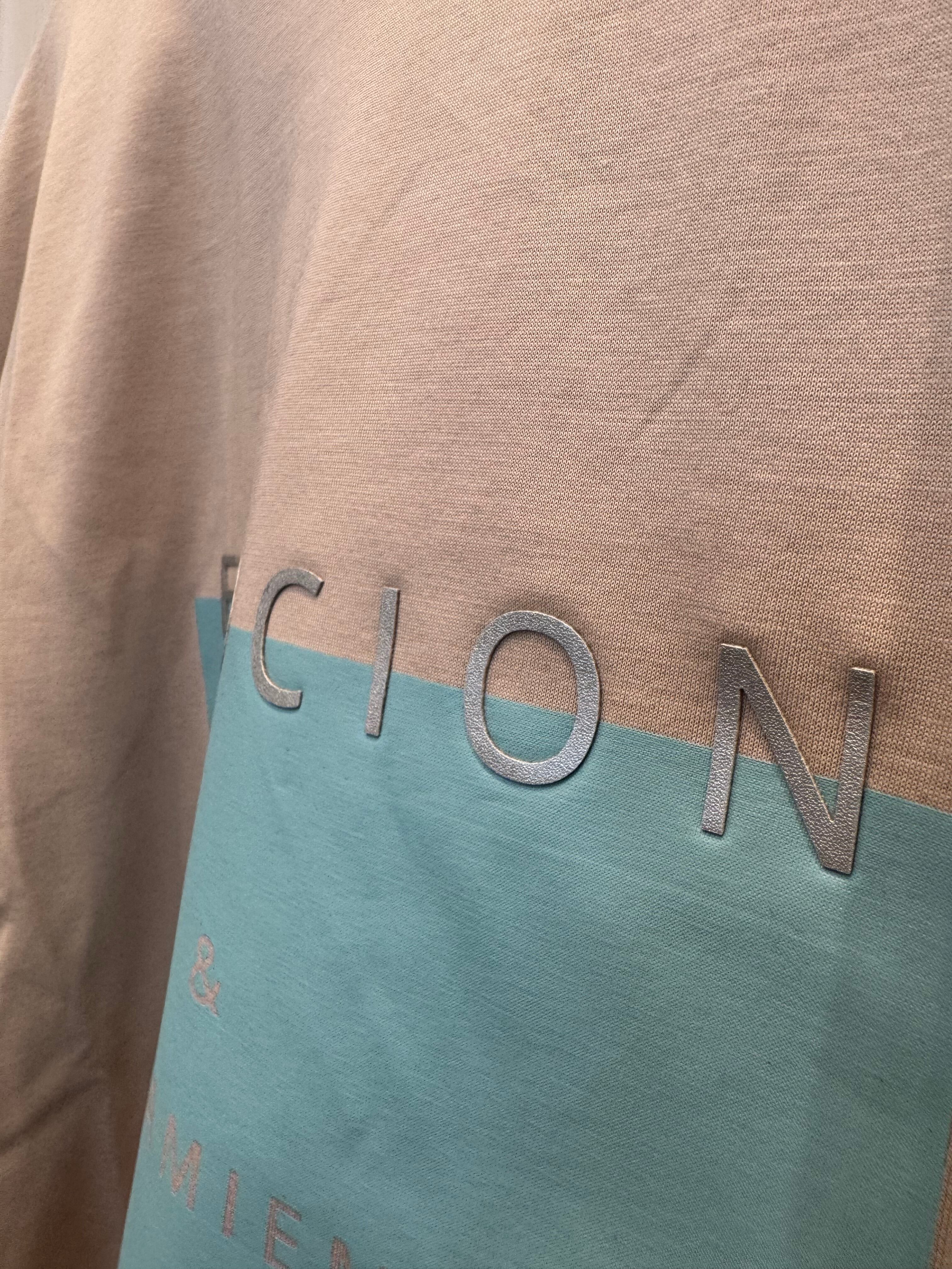 フロントのボックスプリントと合皮ヒートカットロゴプリントがカジュアルながらも洗練された印象をプラス。