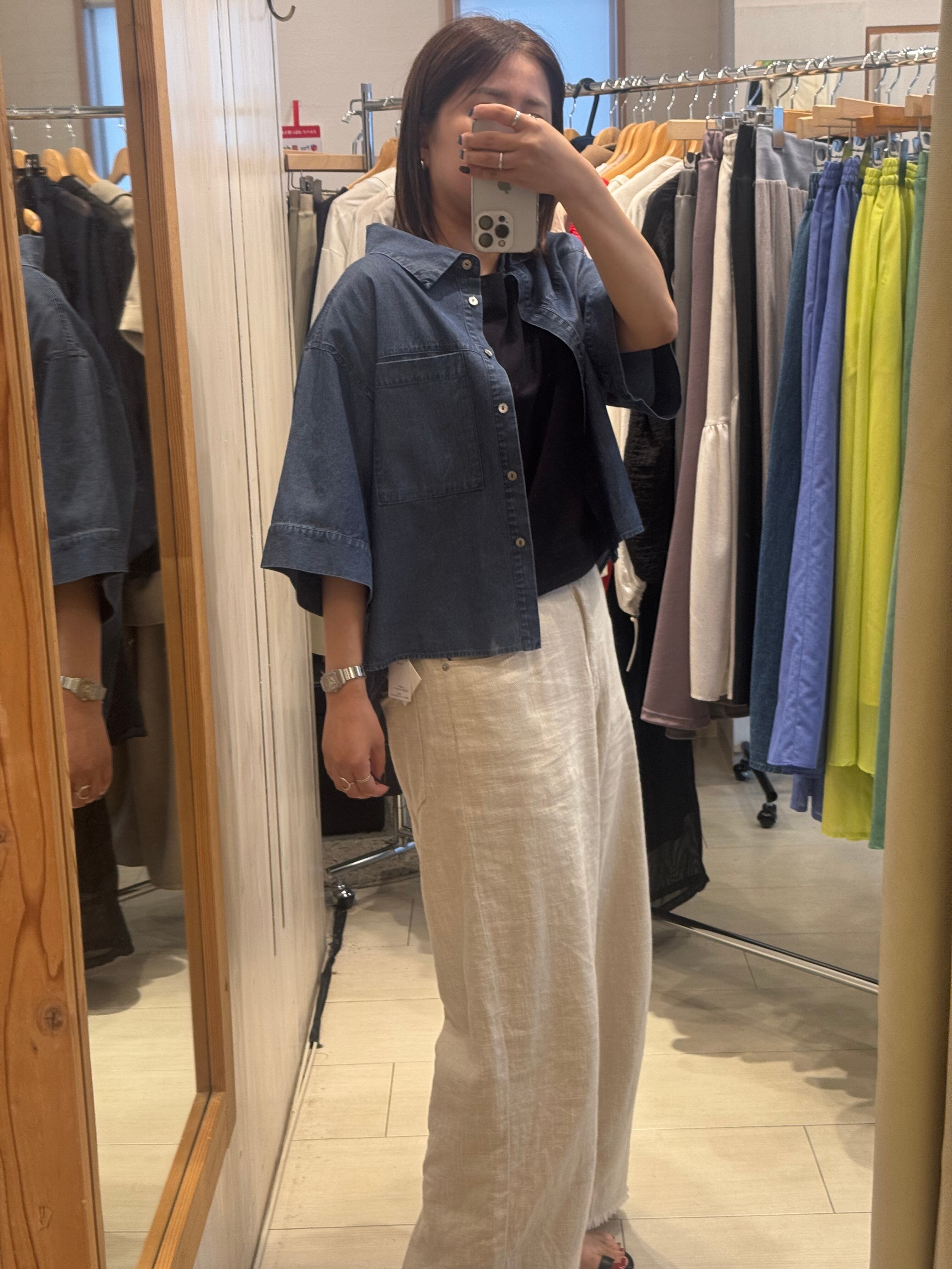 メンズライクなボックスシルエットですが素材の落ち感が女性らしくも。