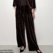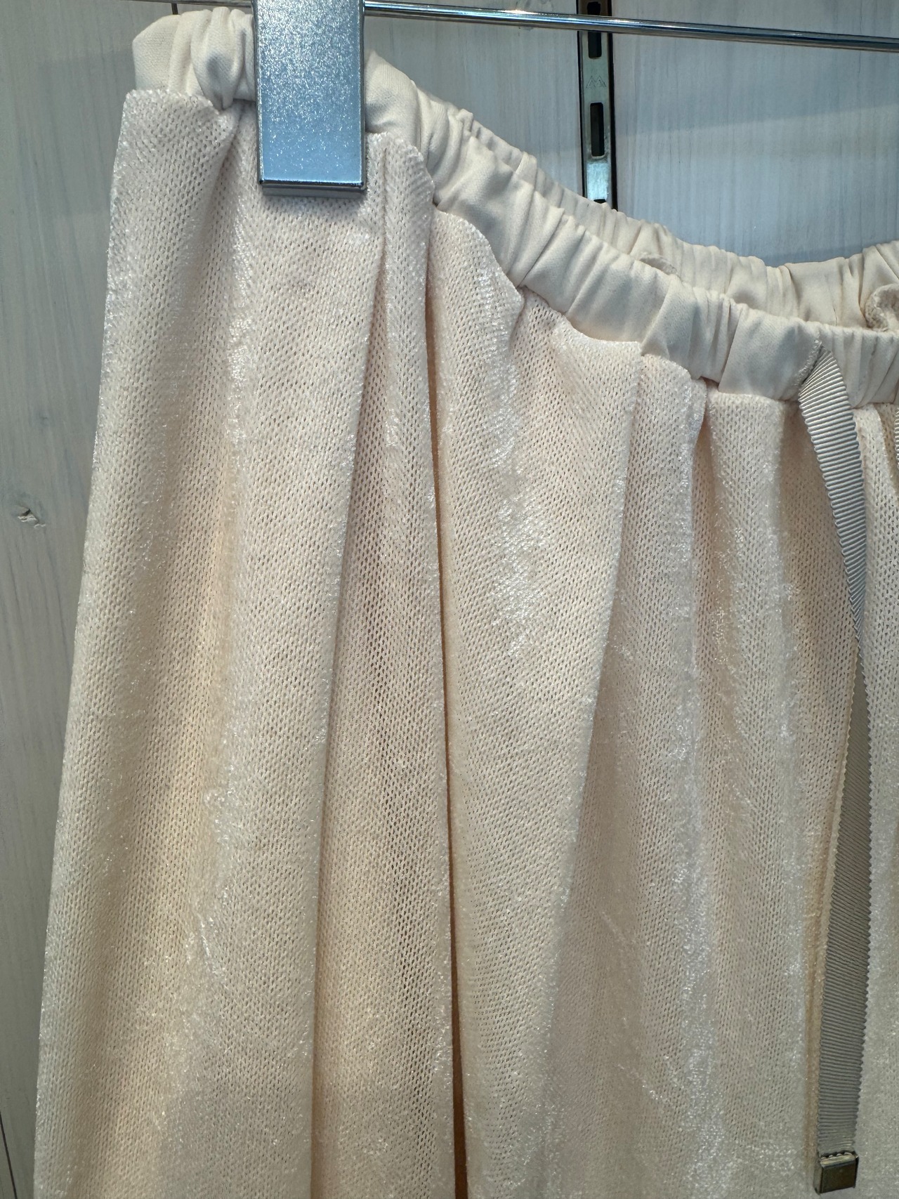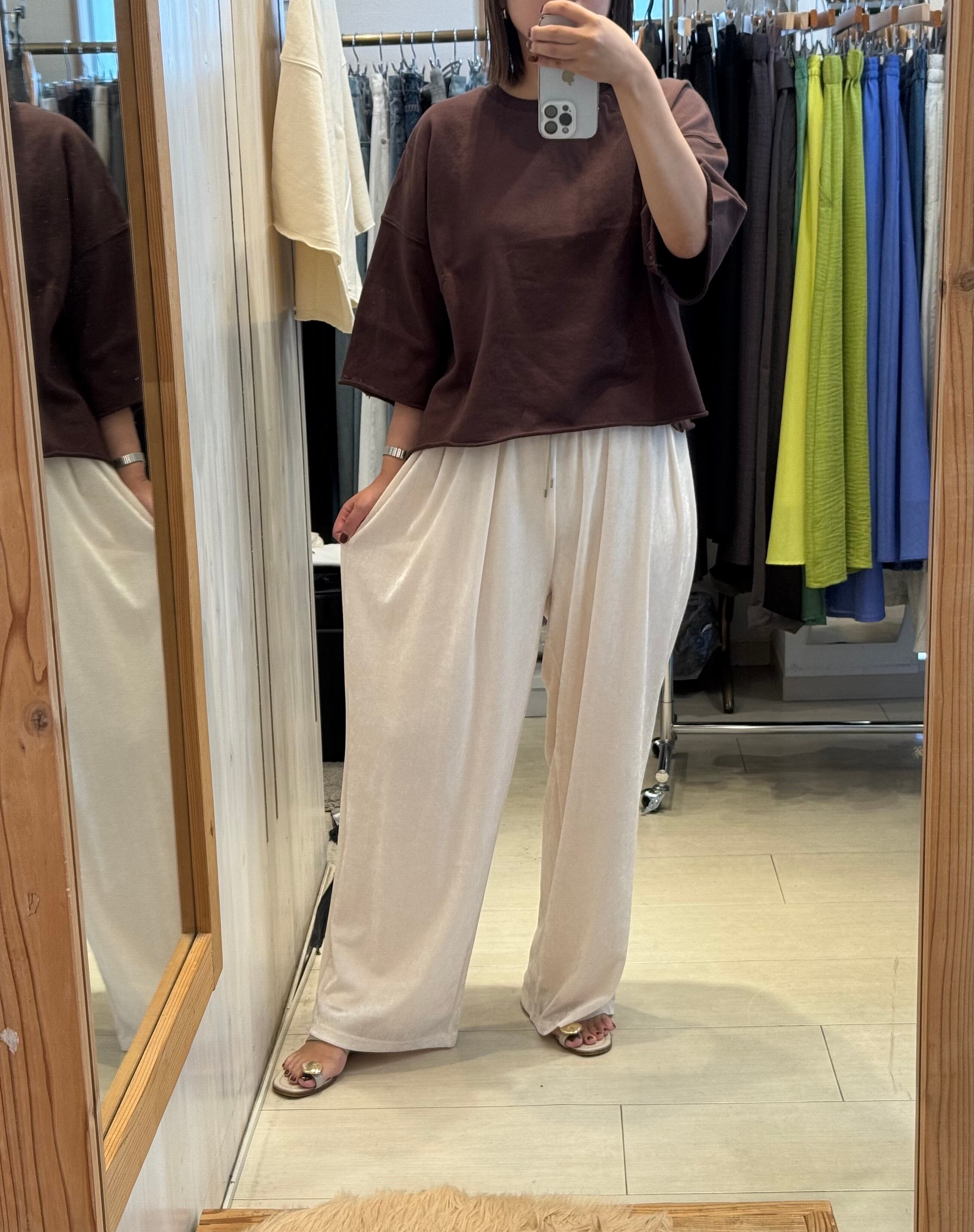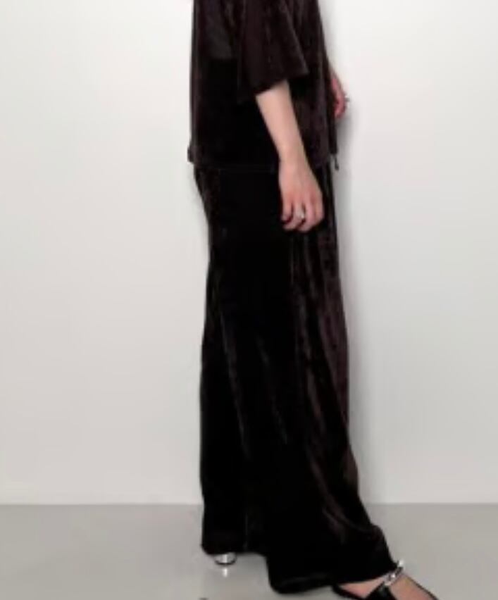 ベロアメッシュ素材のパンツは、シンプルなタックデザインで、ゆったりとしたワイドシルエットになっています。ウエストは履きやすいイージー仕様です。メッシュ素材にベロアの毛足と光沢が施された特徴的な素材なので、1枚取り入れるだけで印象的なスタイリングになります。