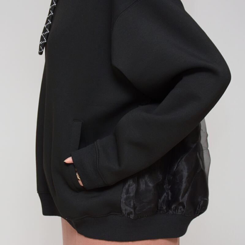 後ろ身頃を軽やかなオーガンジー素材に切り替えることで、重たくなりがちなパーカーに抜け感をプラス。