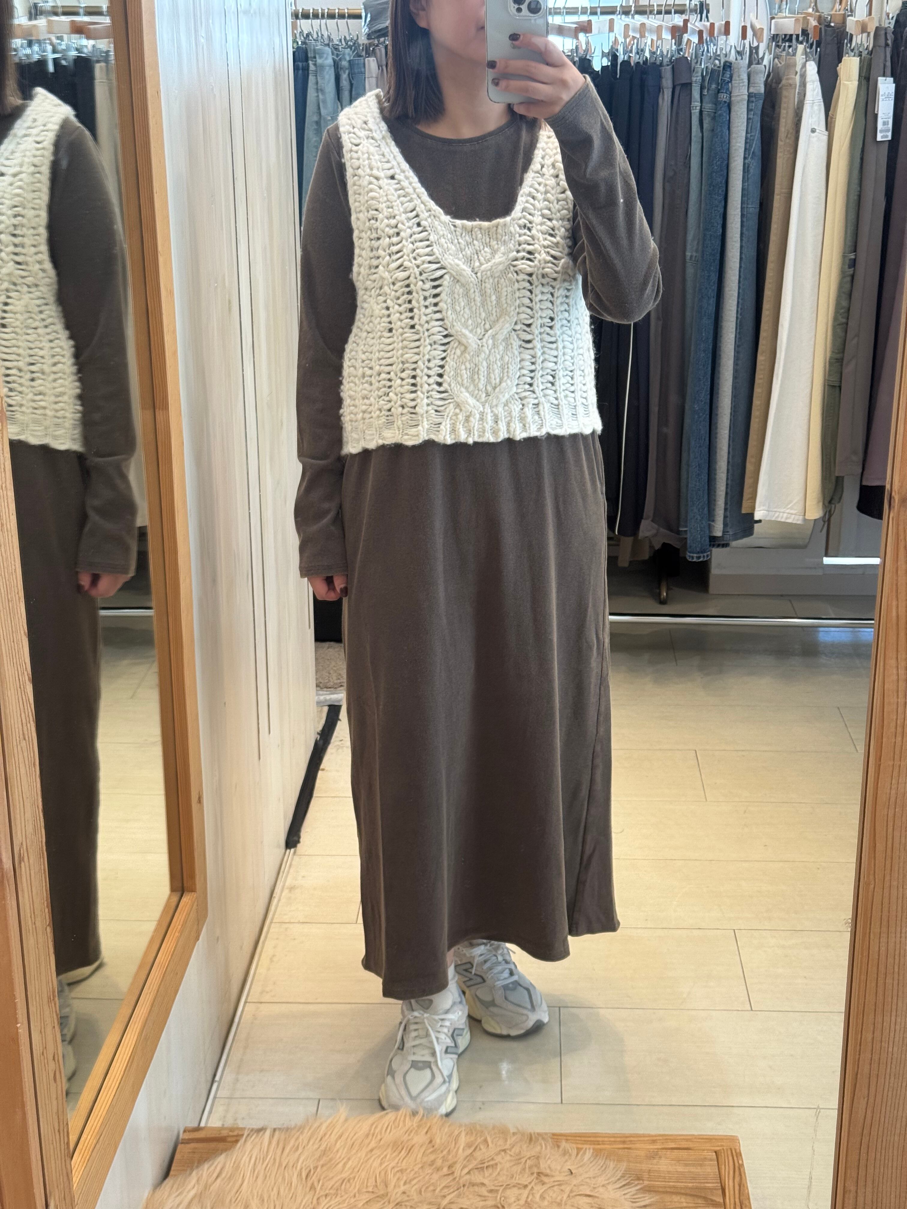 温かみのあるケーブル編みが季節感を演出するニットベスト。