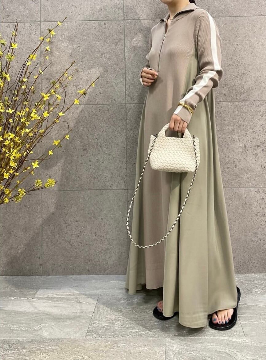【ROSIEE】袖配色ラインハーフジップ布帛切り替えニットワンピース