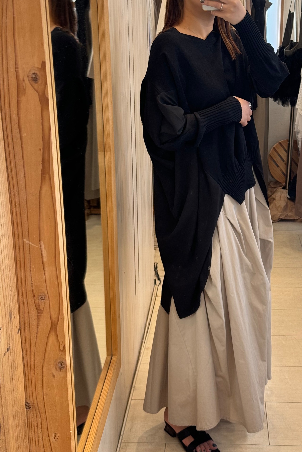 Vネックで首元を美しく魅せ、抜け感をプラス。