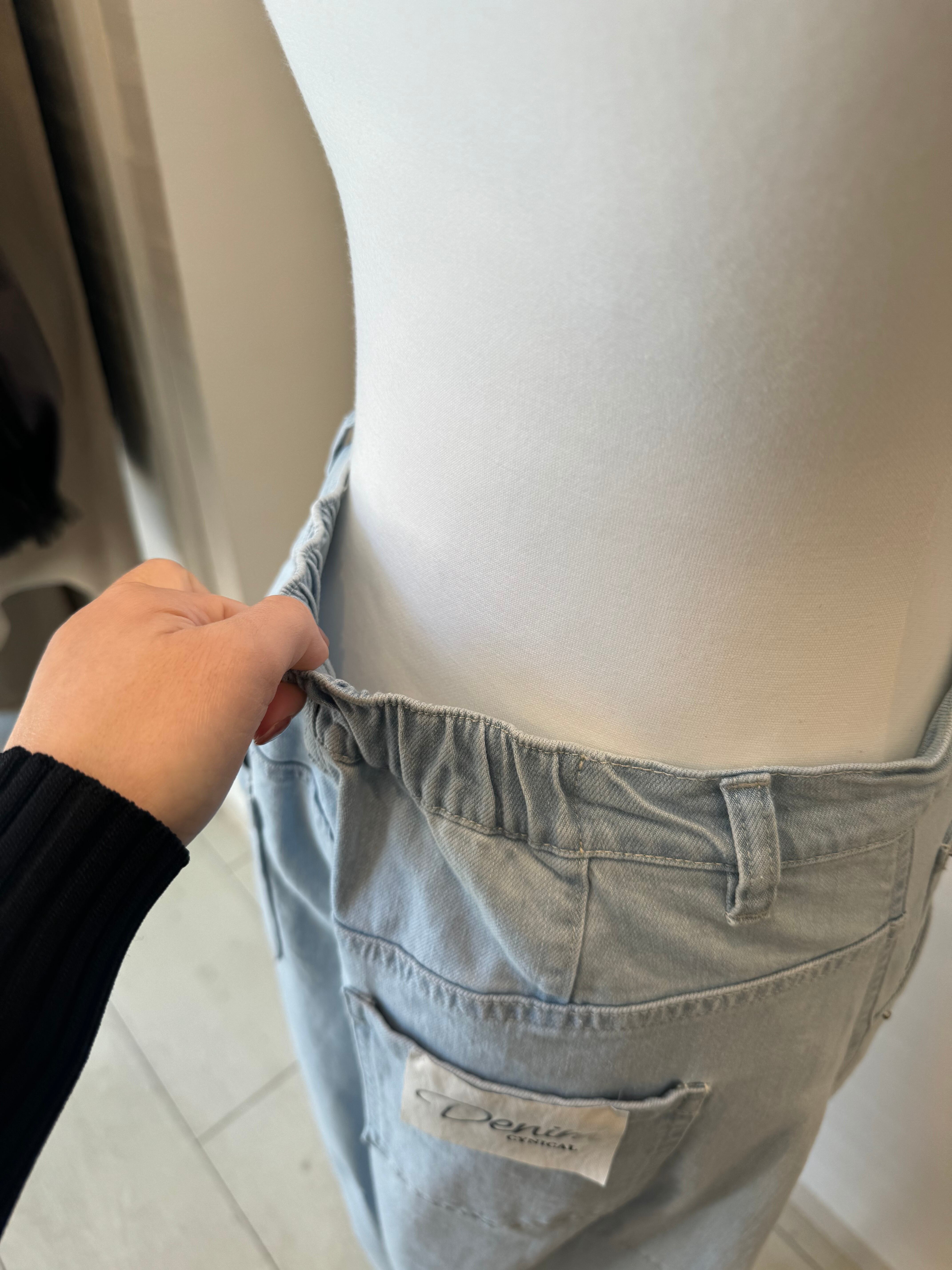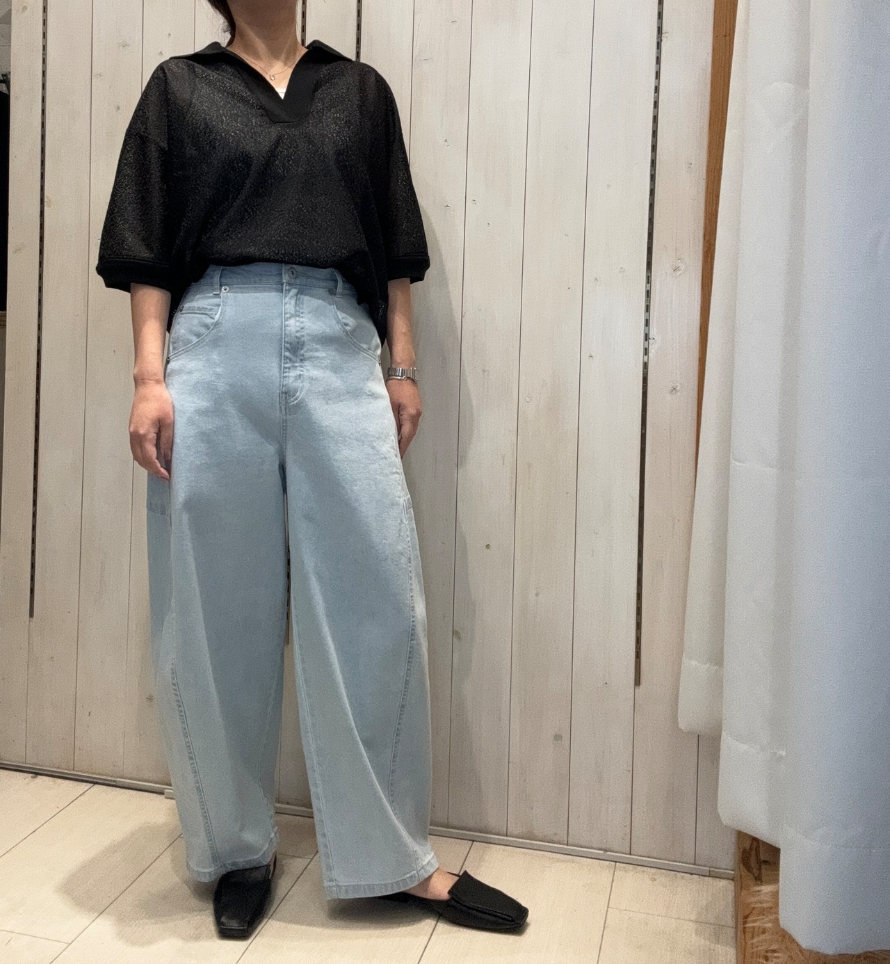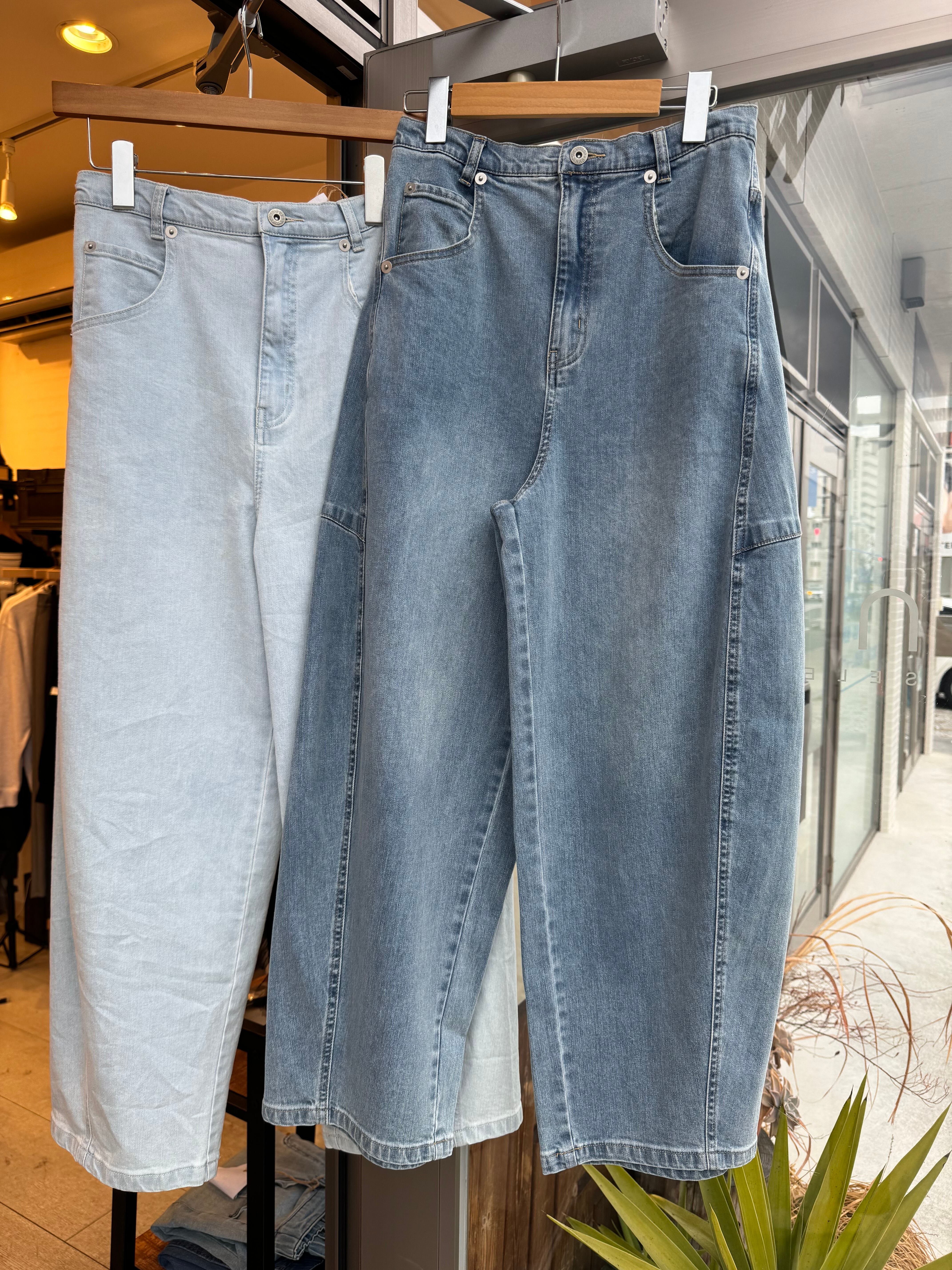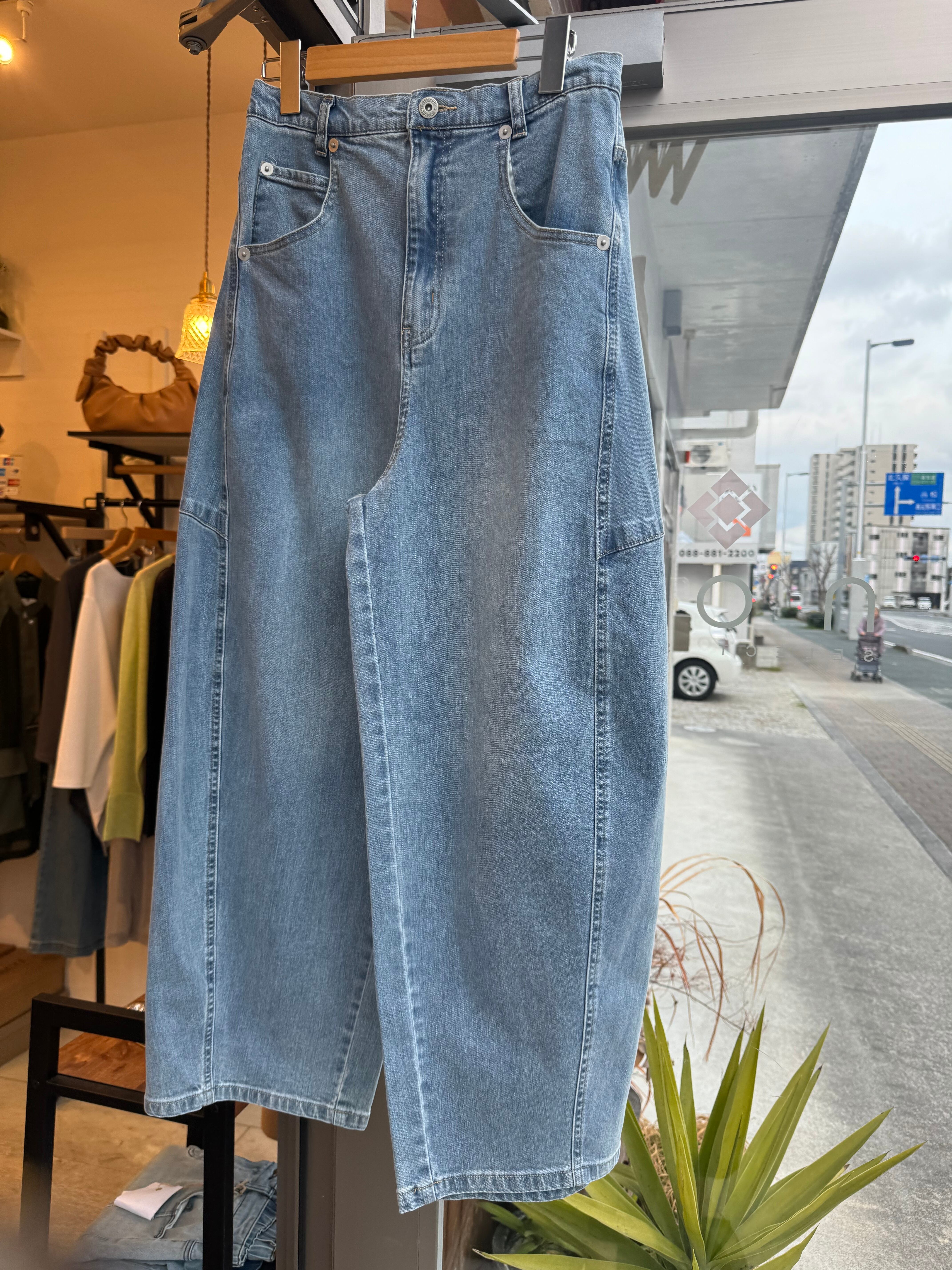 丸みを帯びたゆったりしたシルエットのコクーンデニムパンツ。