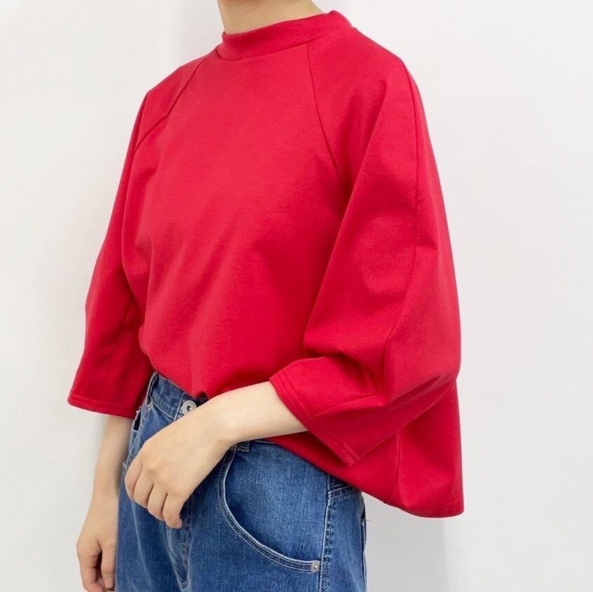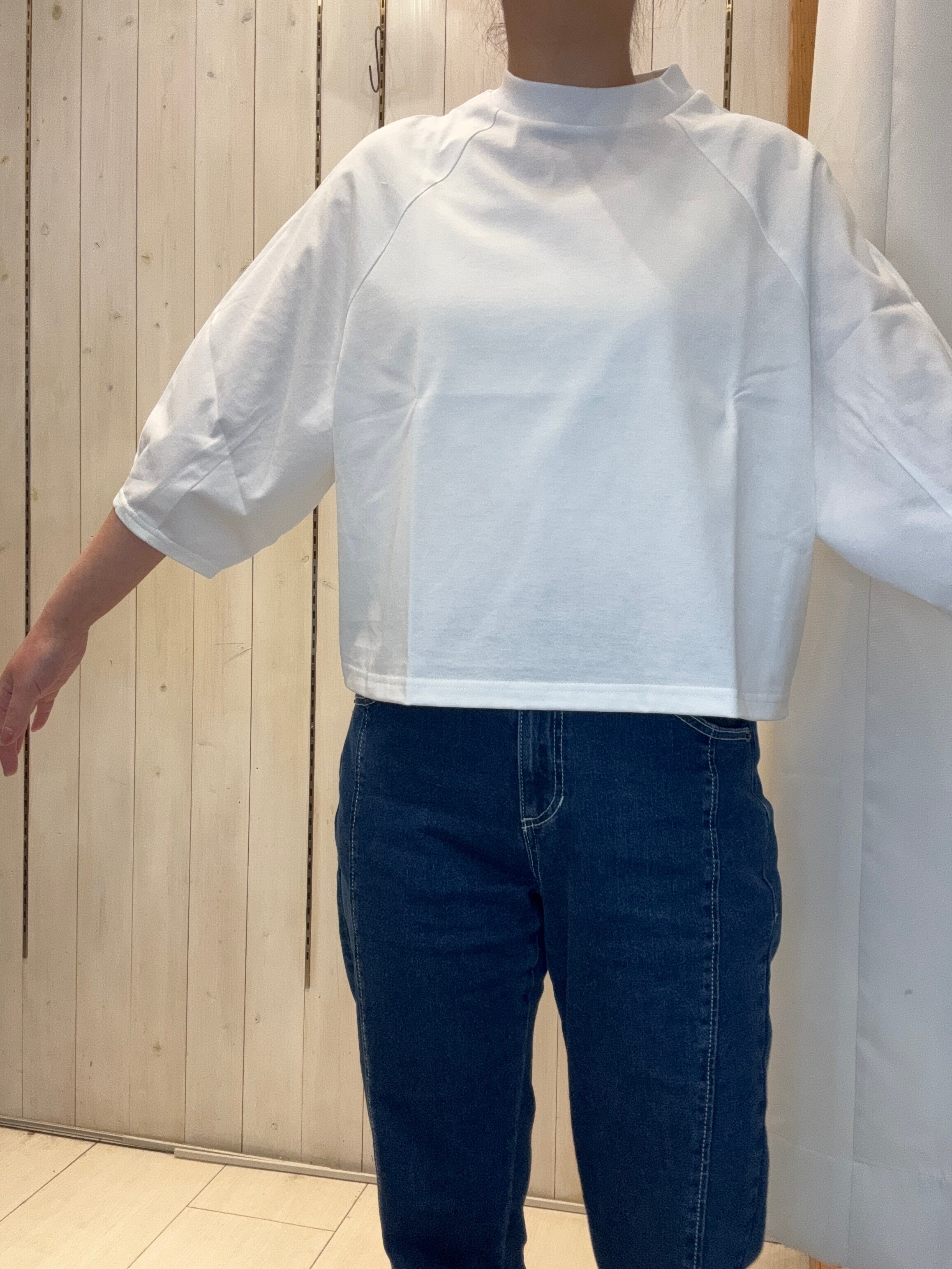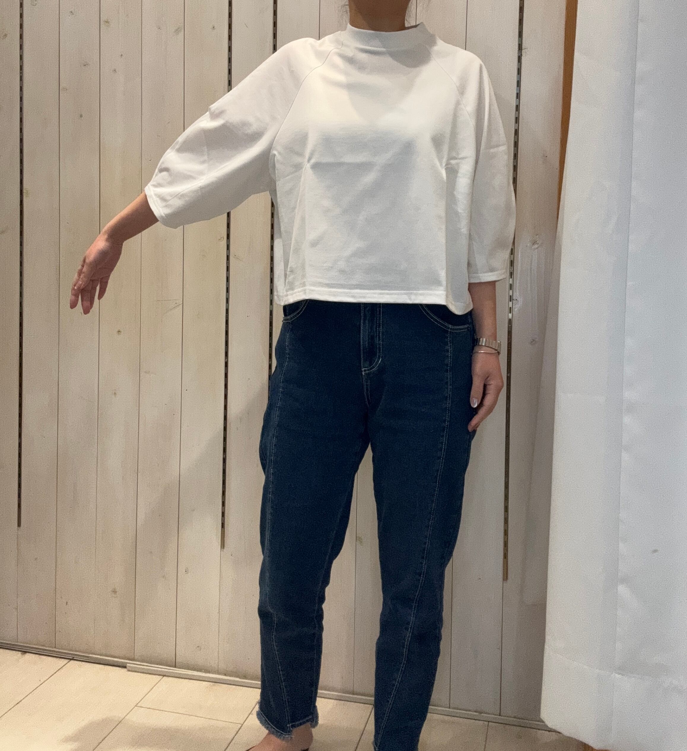 ハイウエストボトムスやスカートに合わせやすい丈感です。