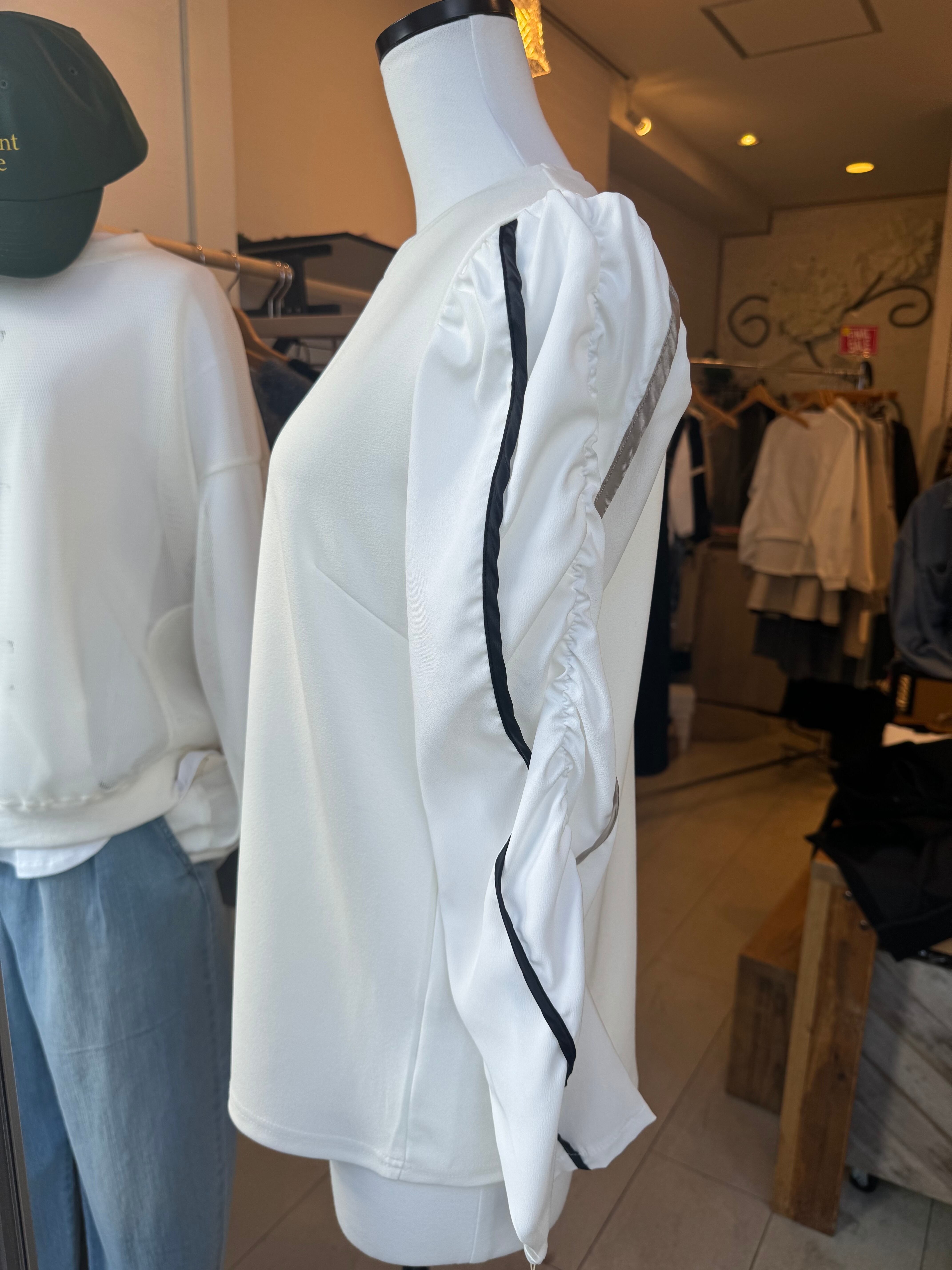 袖がシアー素材のカットソー。