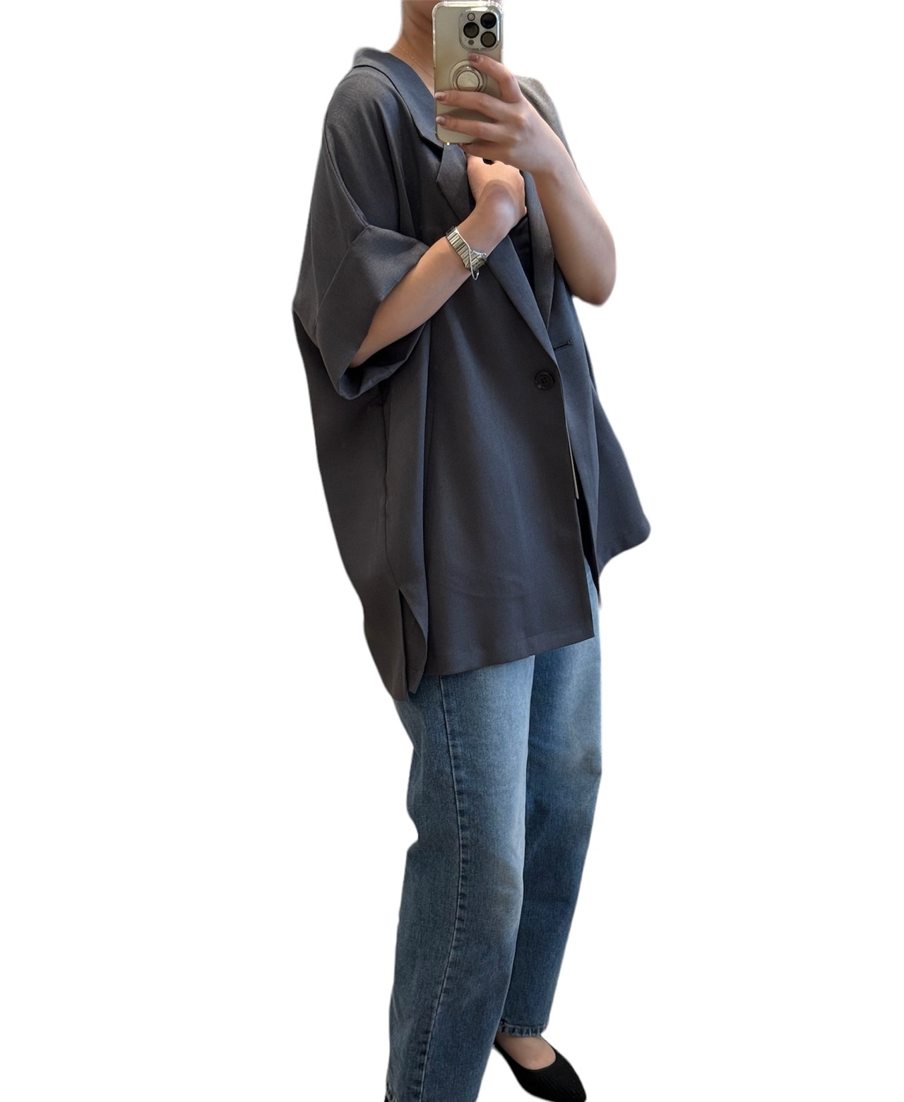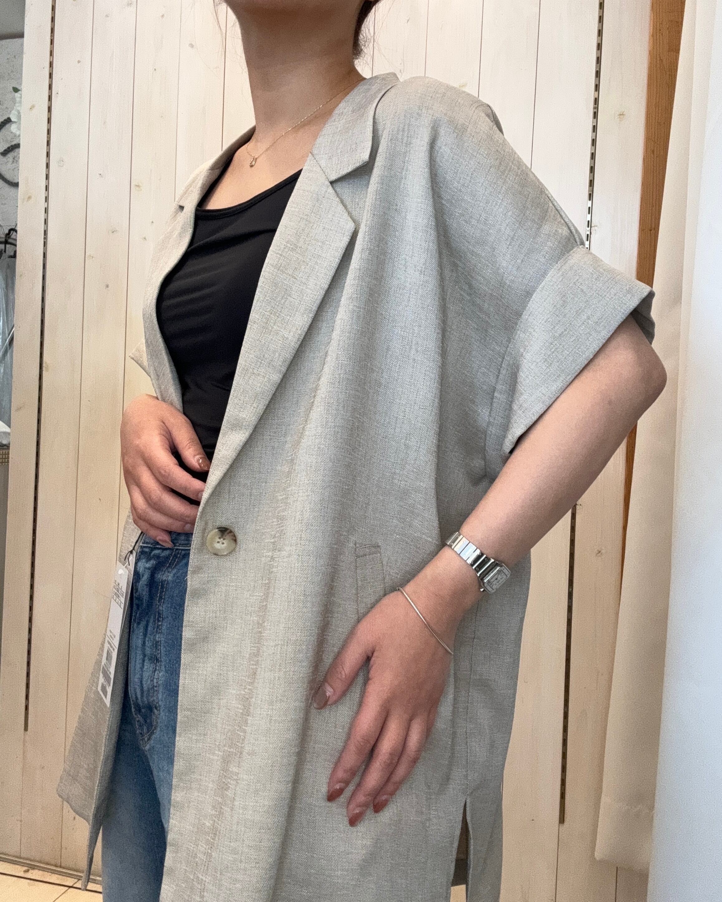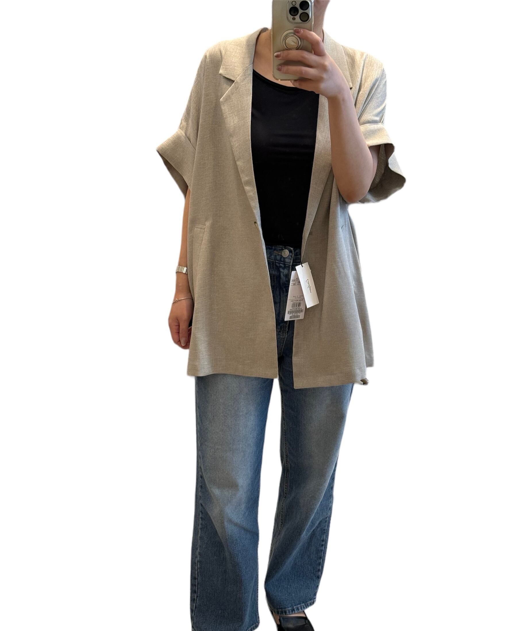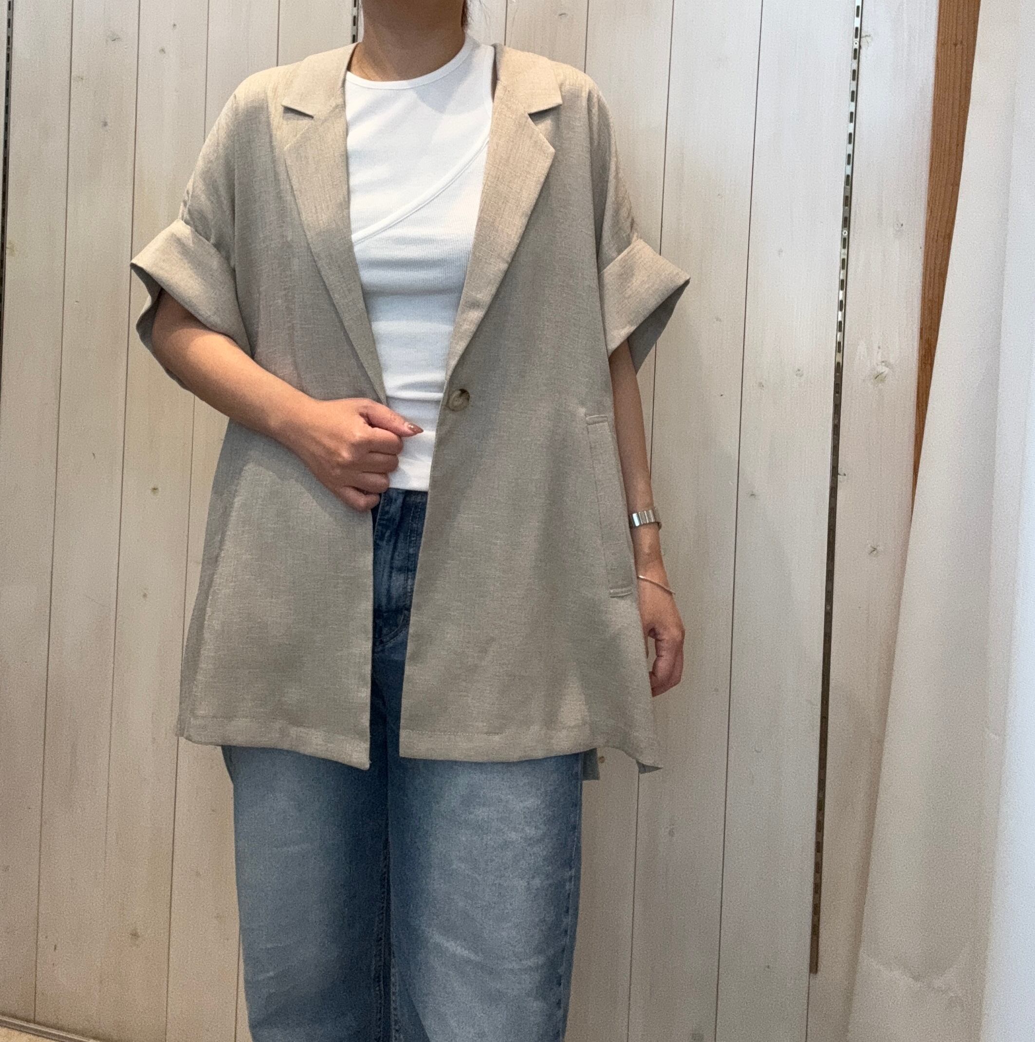 麻ライクの5分そでジャケット。