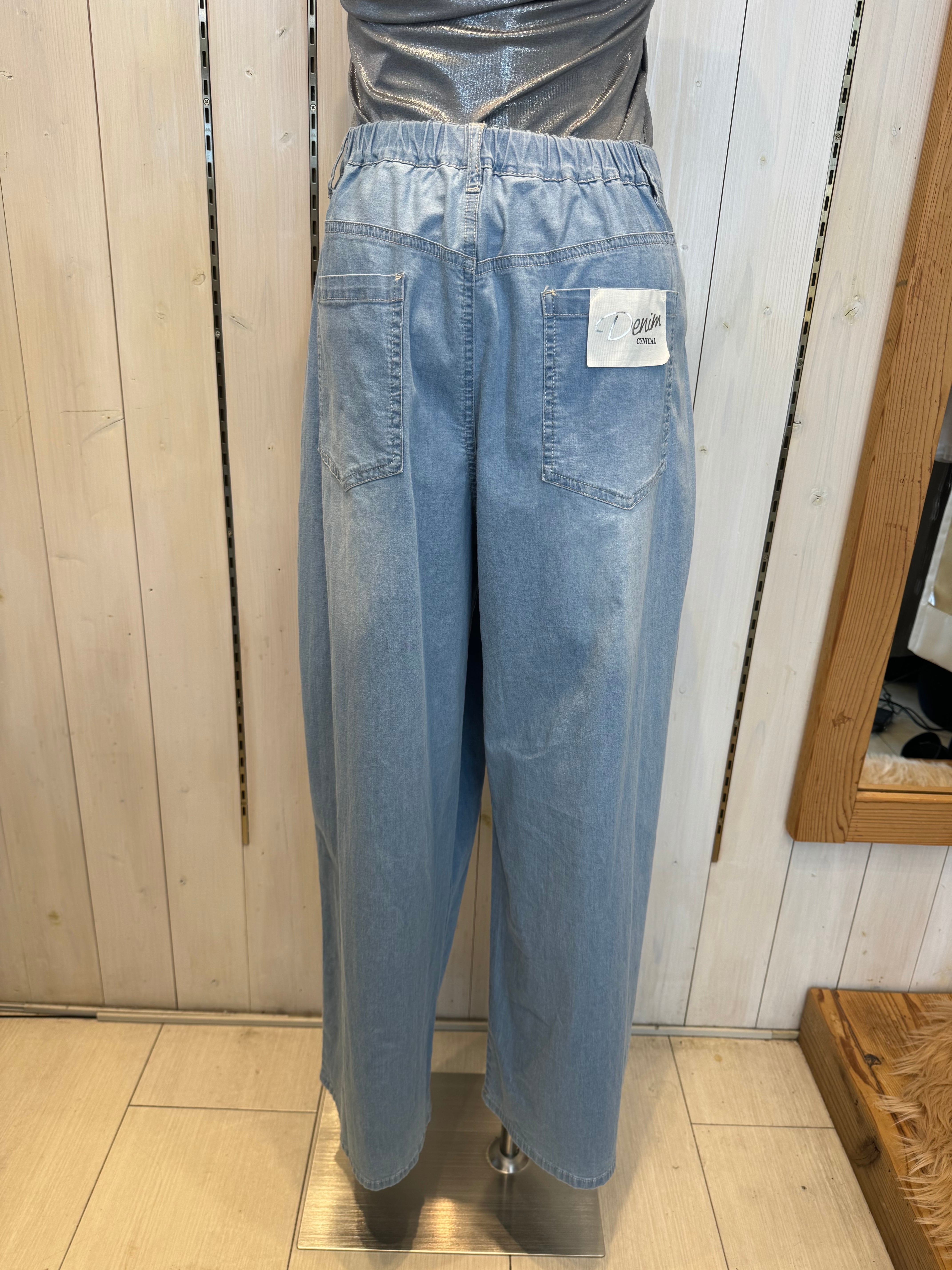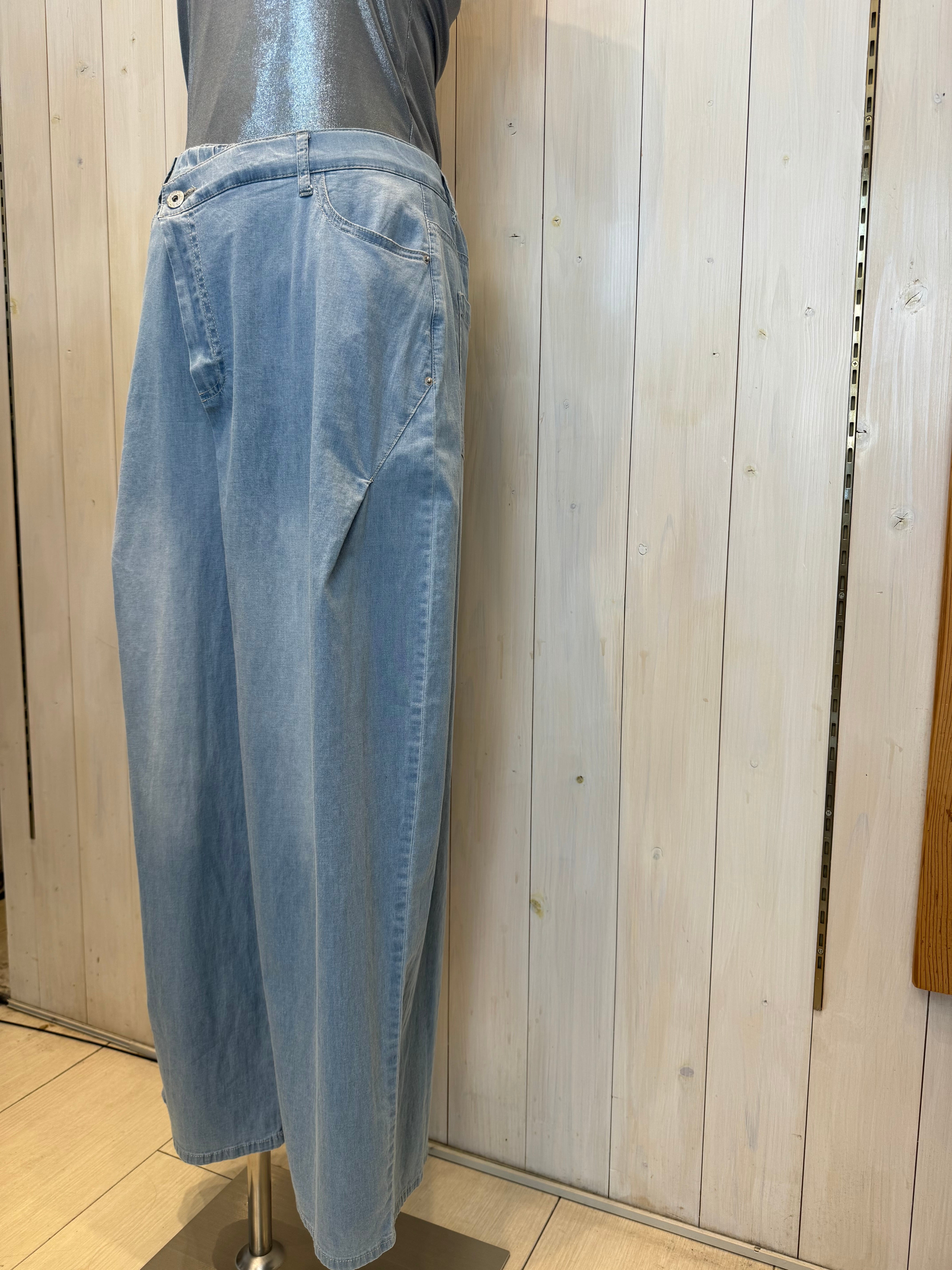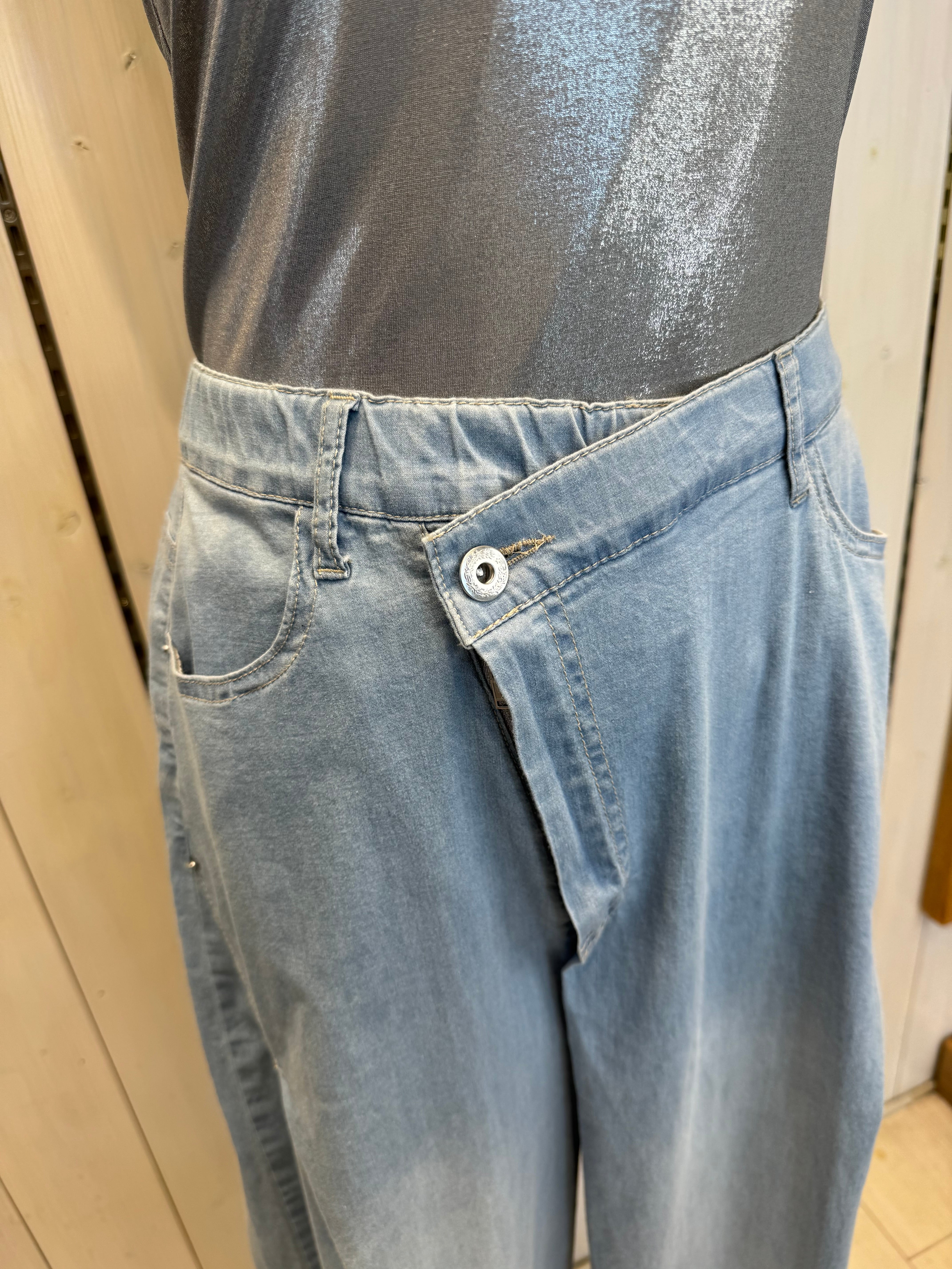 レイヤードしたラップディテールのウエストデザインが特徴のデニムパンツ。