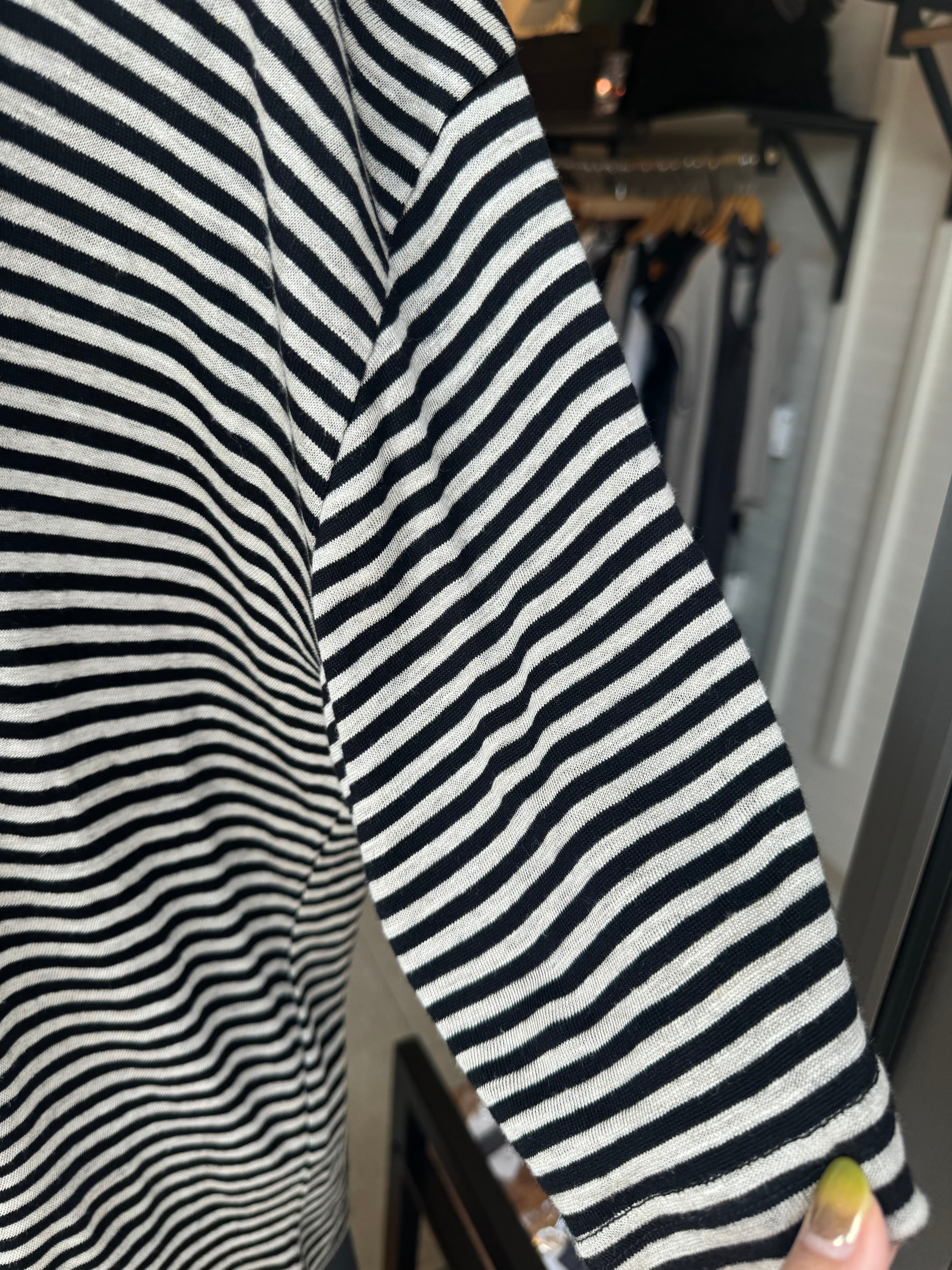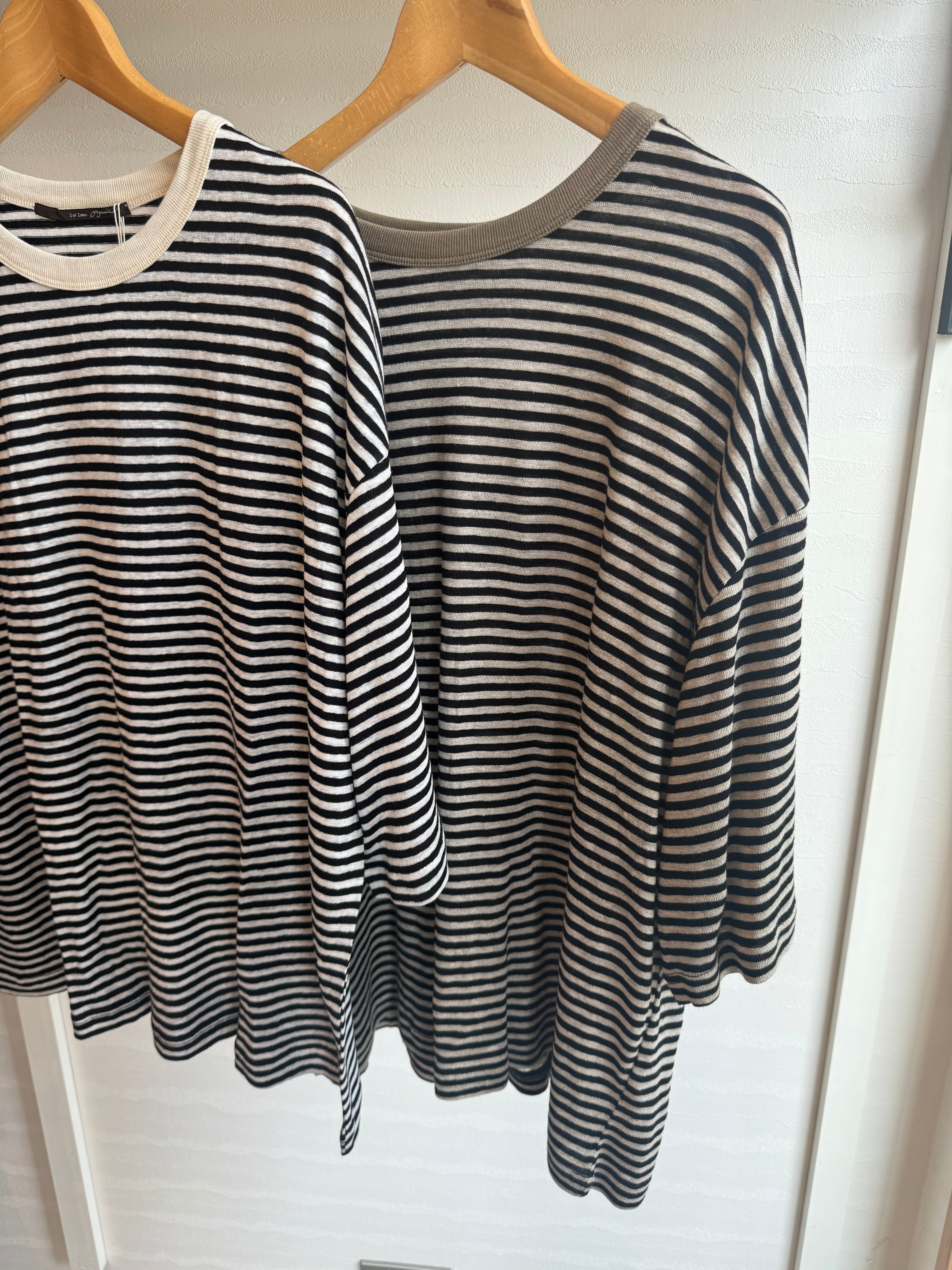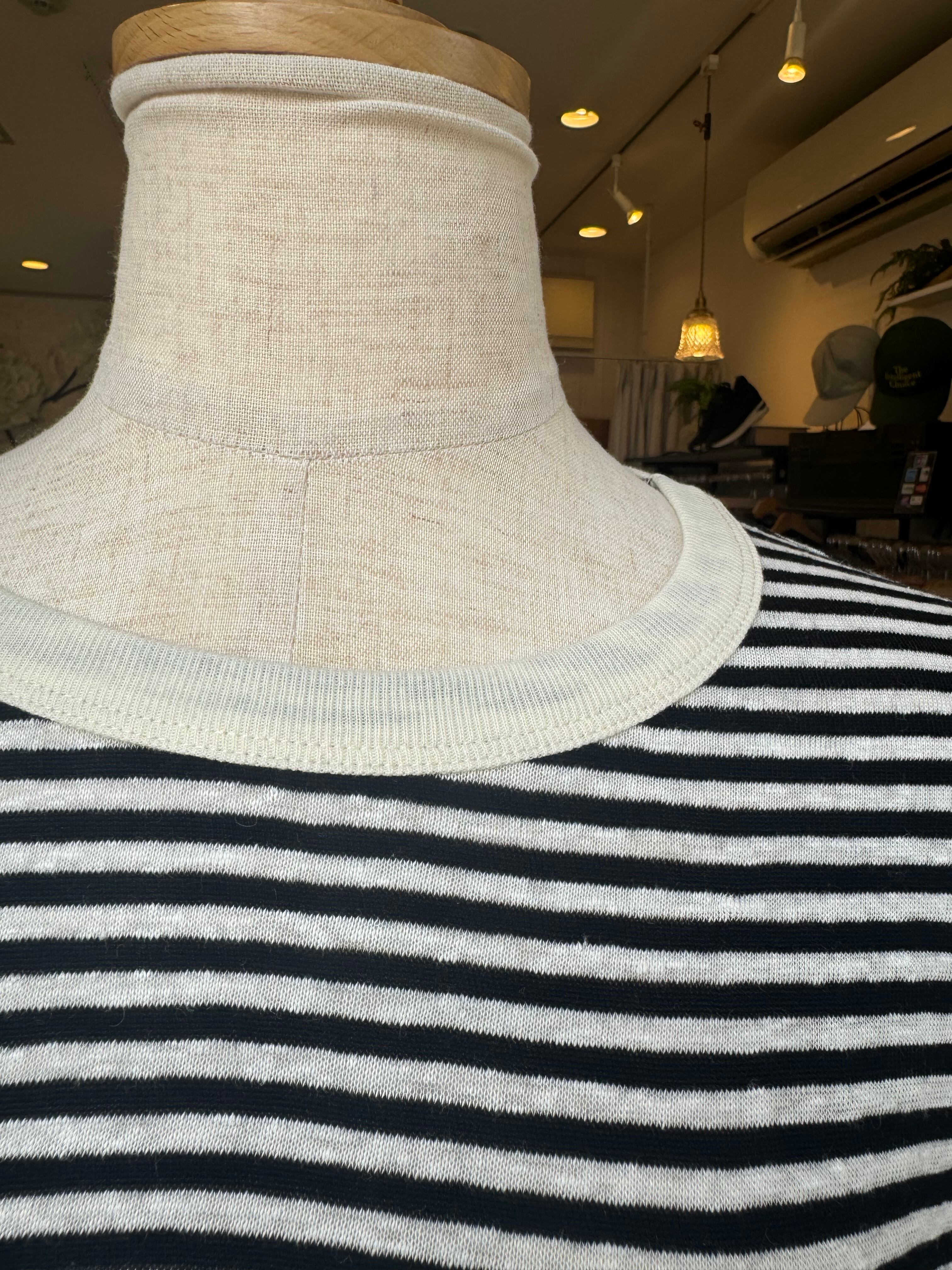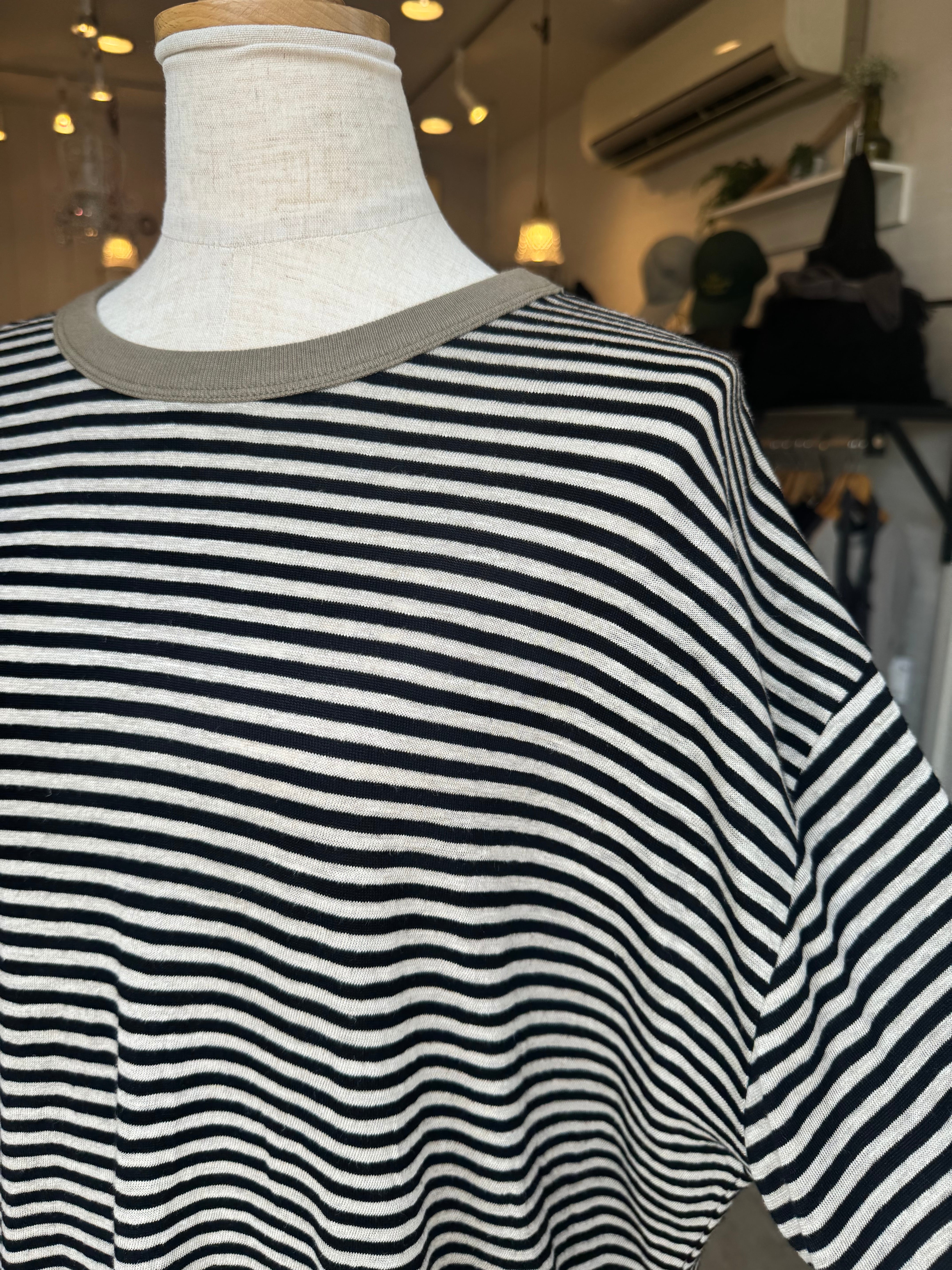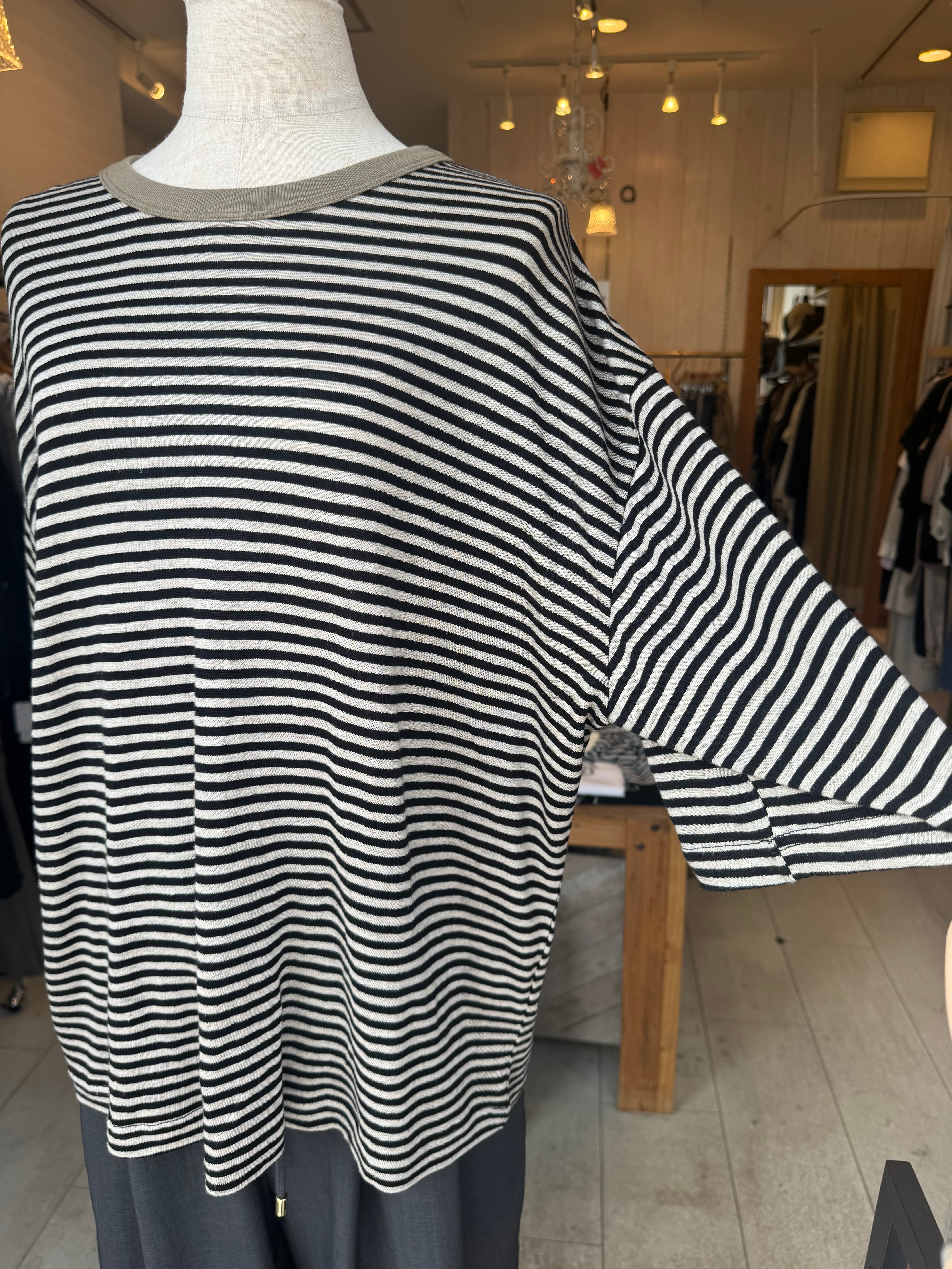 ワイドなシルエットと細めのピッチのボーダー・襟元の配色リブのバランスが、着るだけで「大人」な雰囲気です。落ち感のある素材なので、抜け感もプラス。