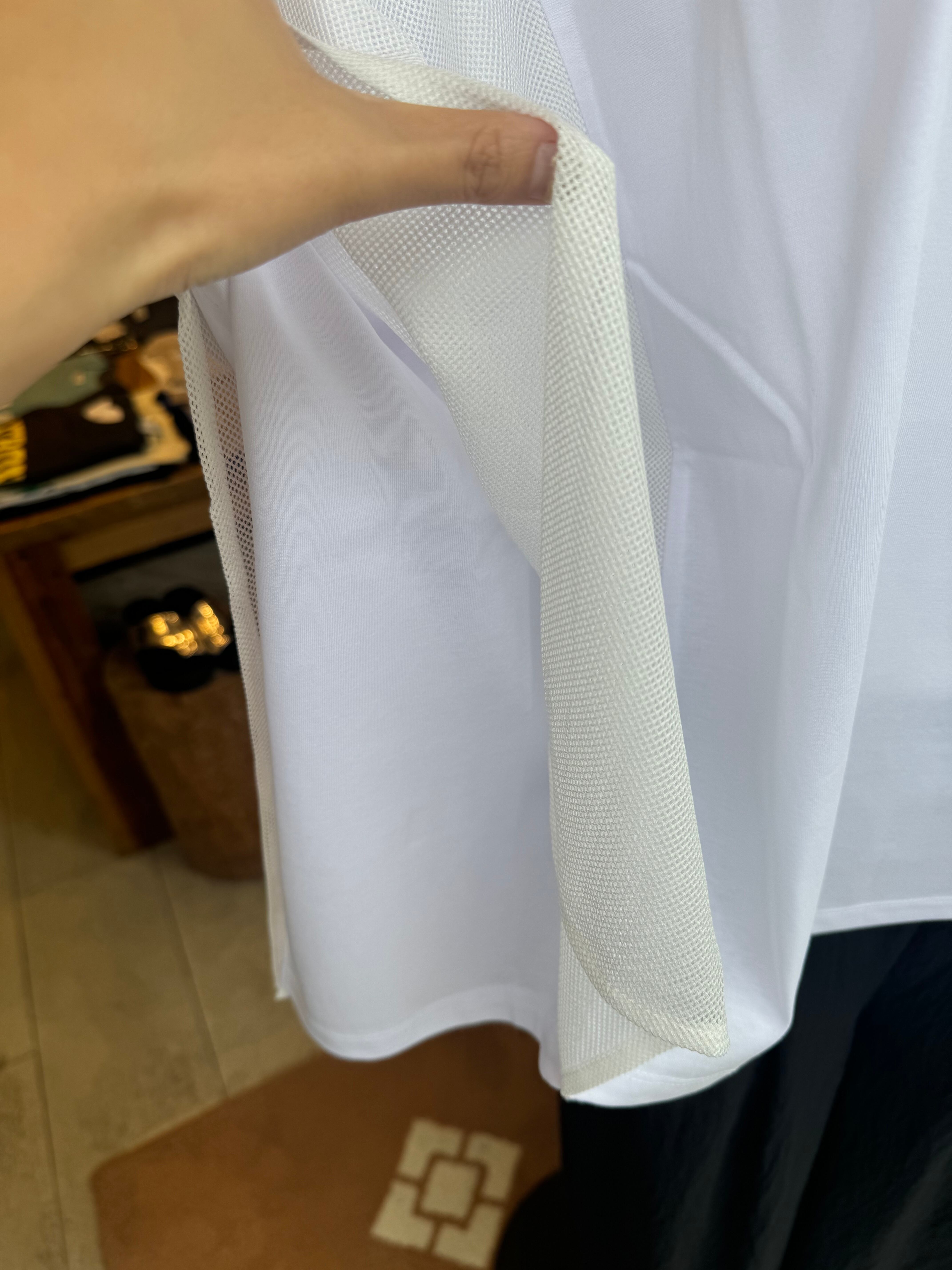 身頃をメッシュ素材で切り替えたアシンメトリーなシルエットも特徴的な1枚です♩