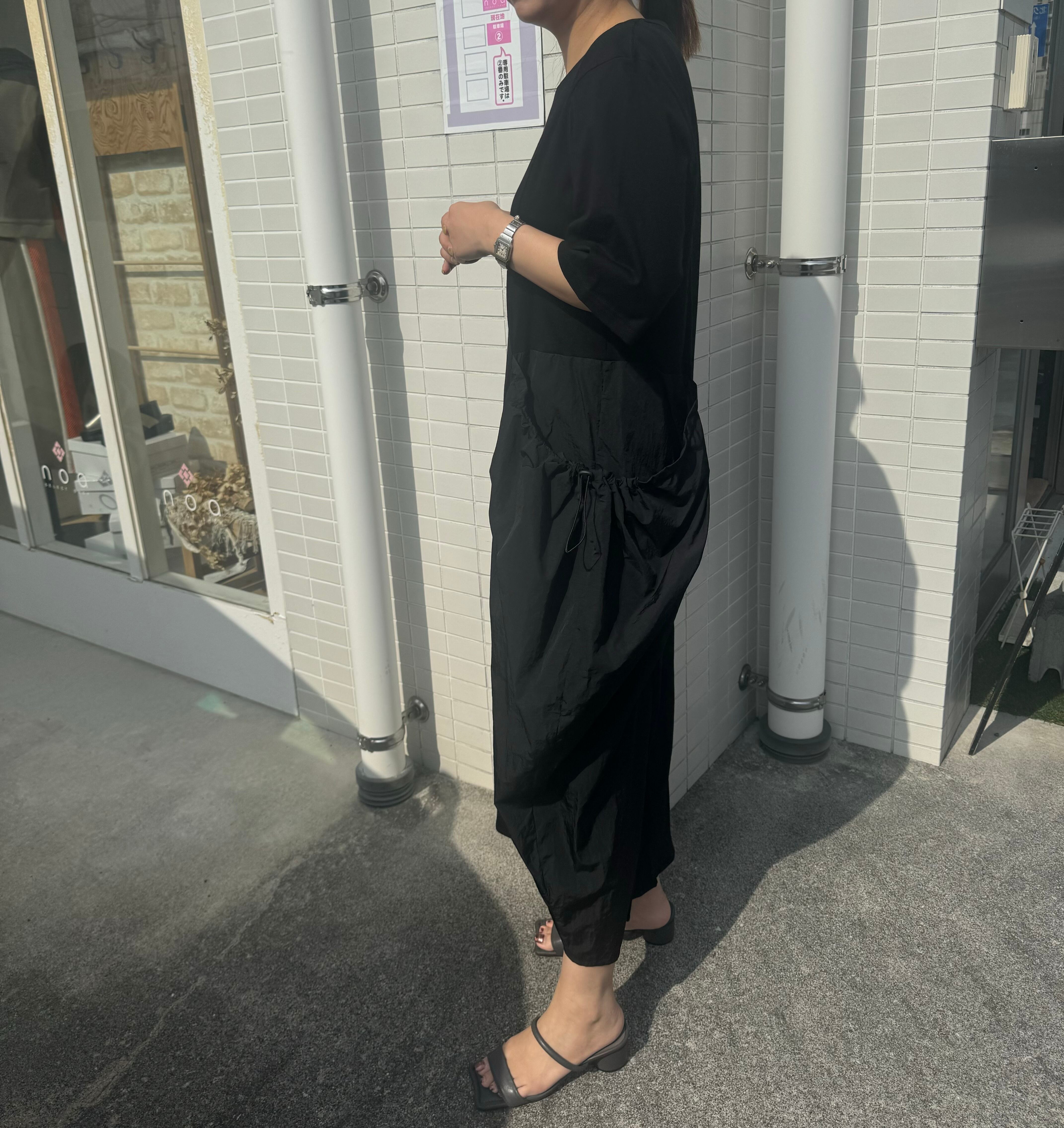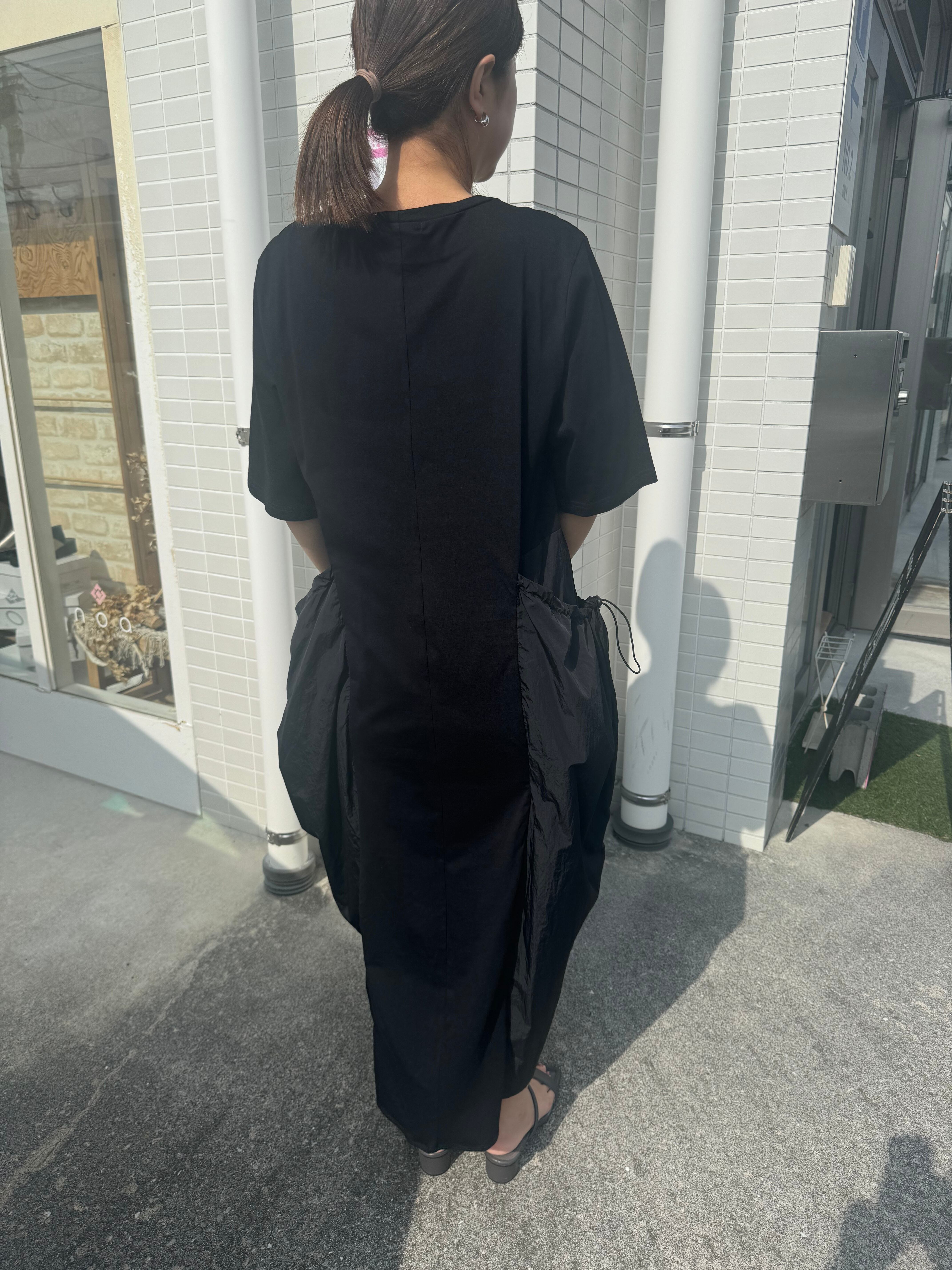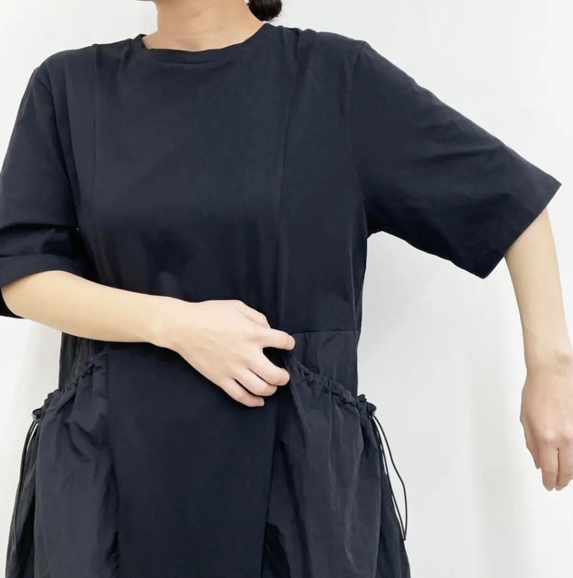 コットン天竺とタフタ生地の異素材で切り替えたドッキングワンピース。