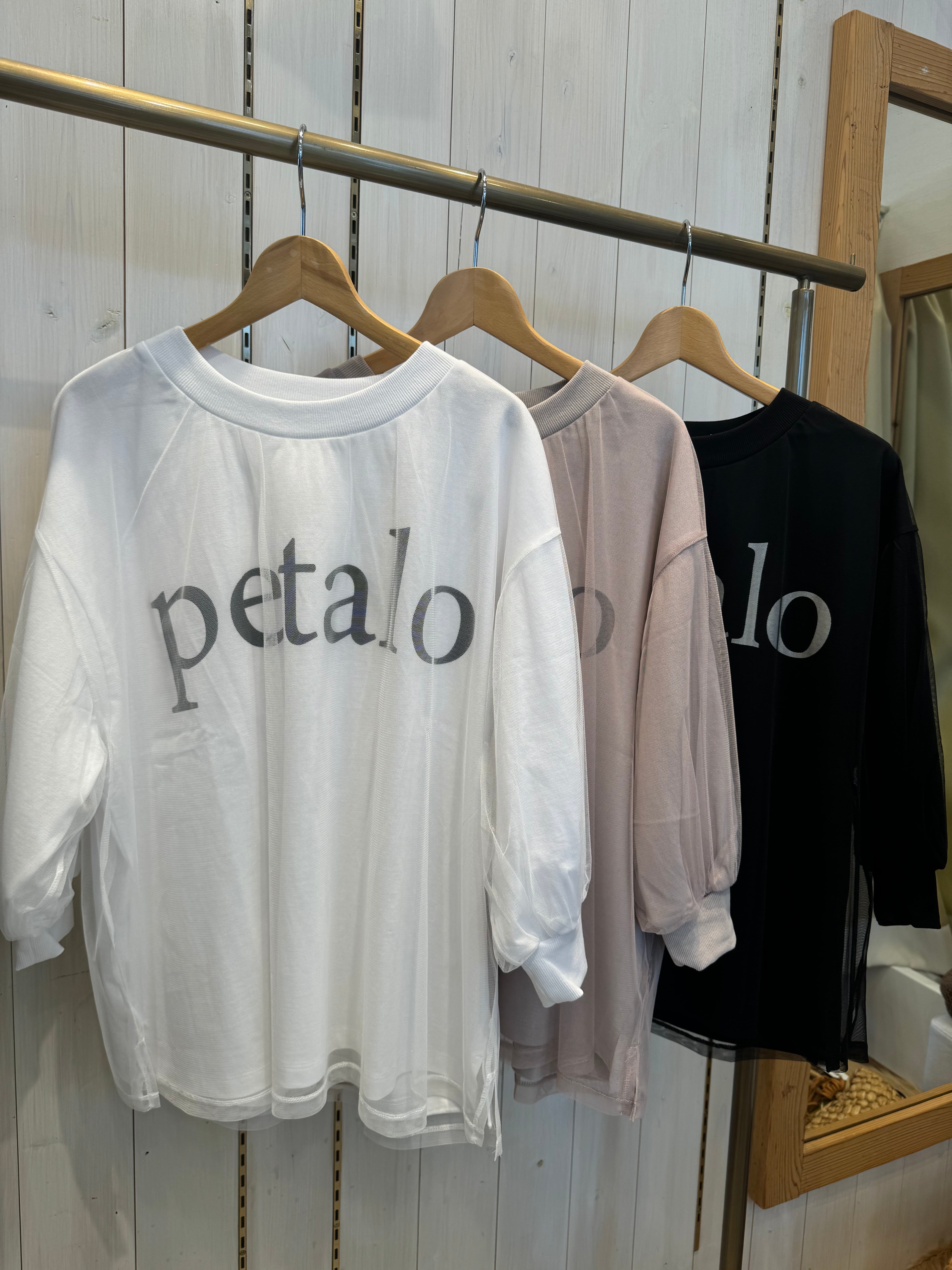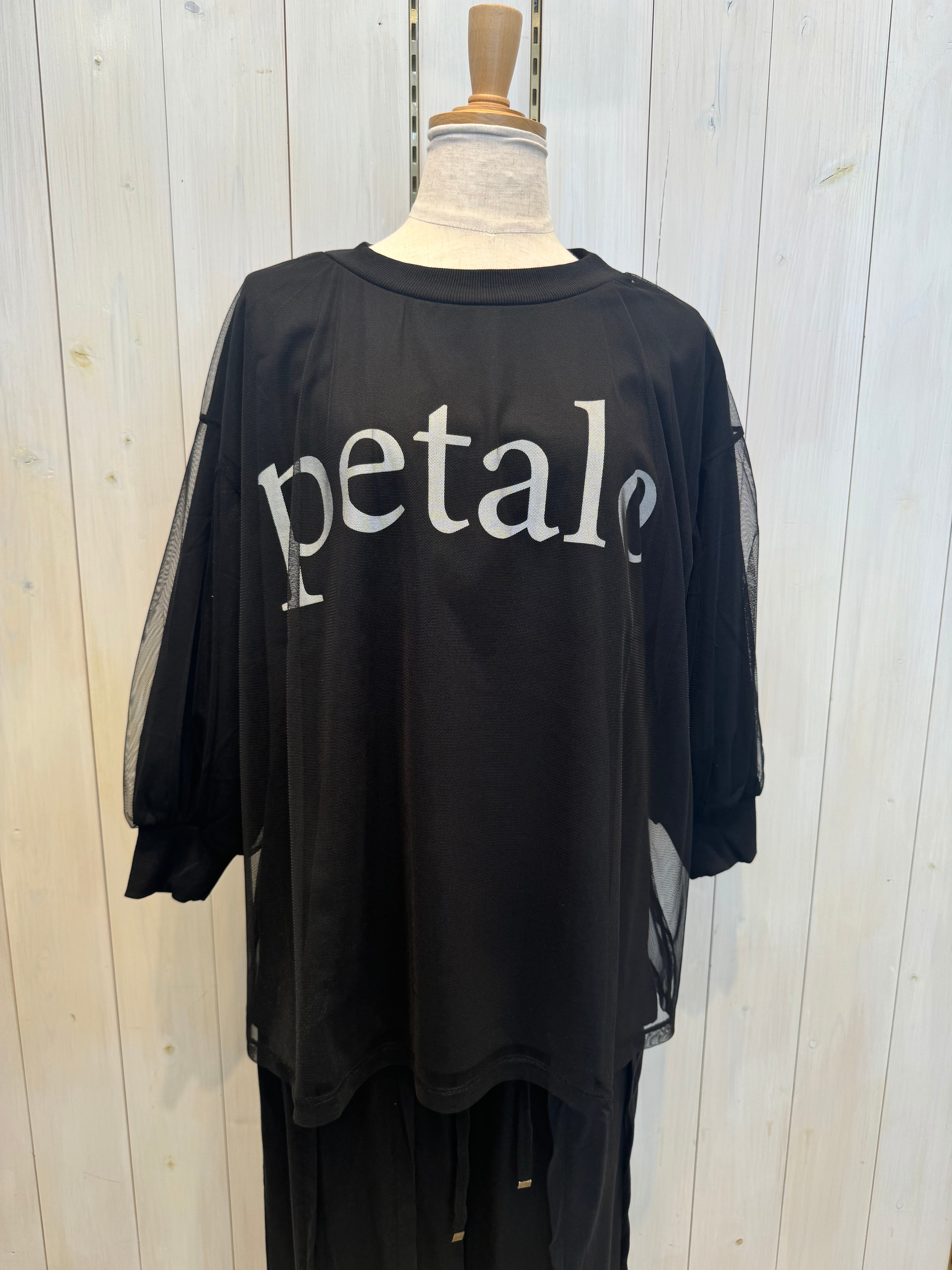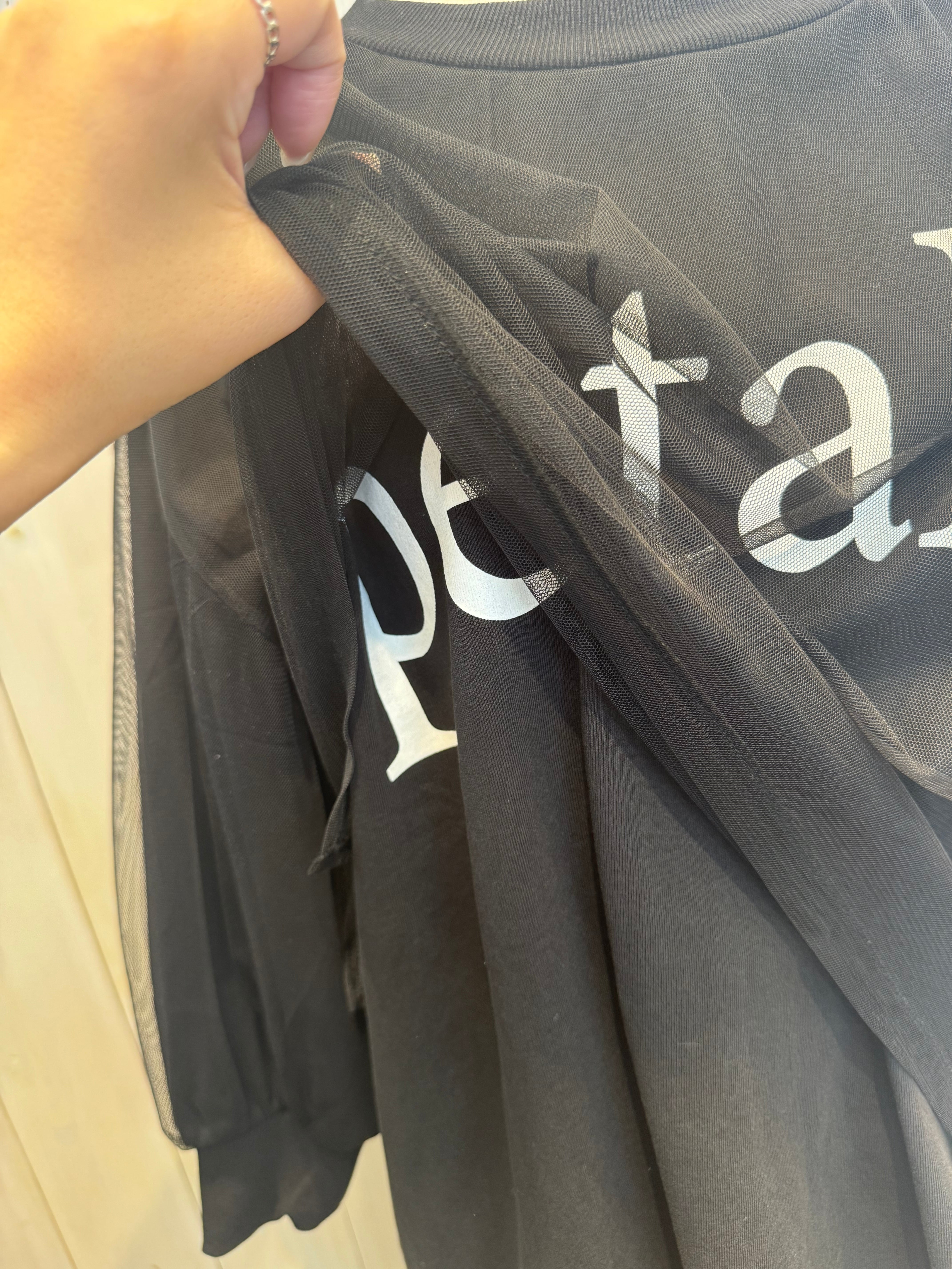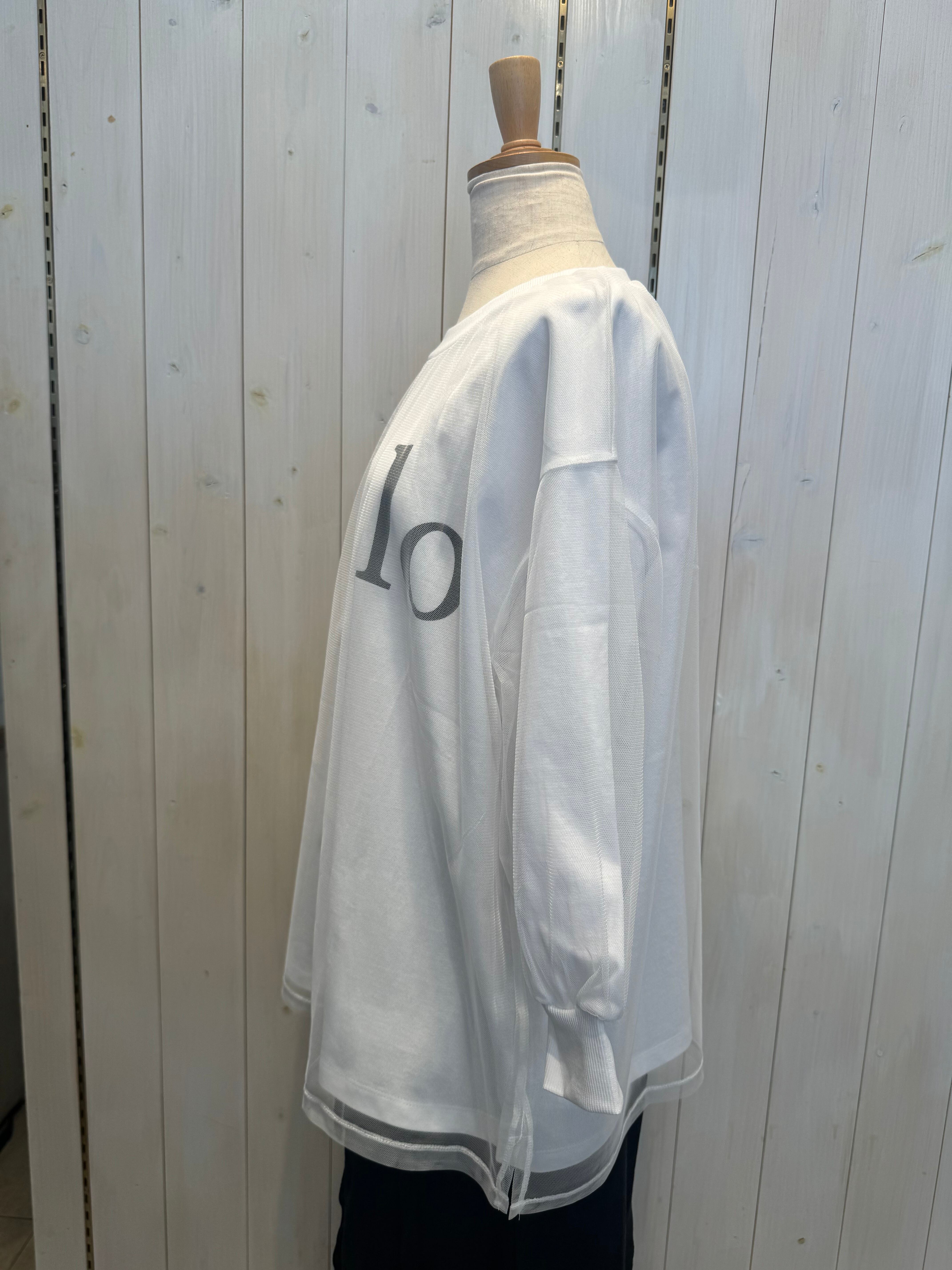 TシャツにチュールがレイヤードされたデザインTシャツ。
