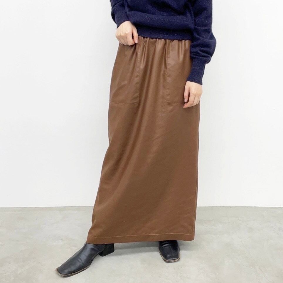 ポリエステルスパンヤーンを使用し天然タッチでしなやかな反発感とドレープ性を持つ薄手素材。表面に光沢加工を施し、オイルを塗りこんだようなヴィンテージ感のある光沢が特徴のスカートです。