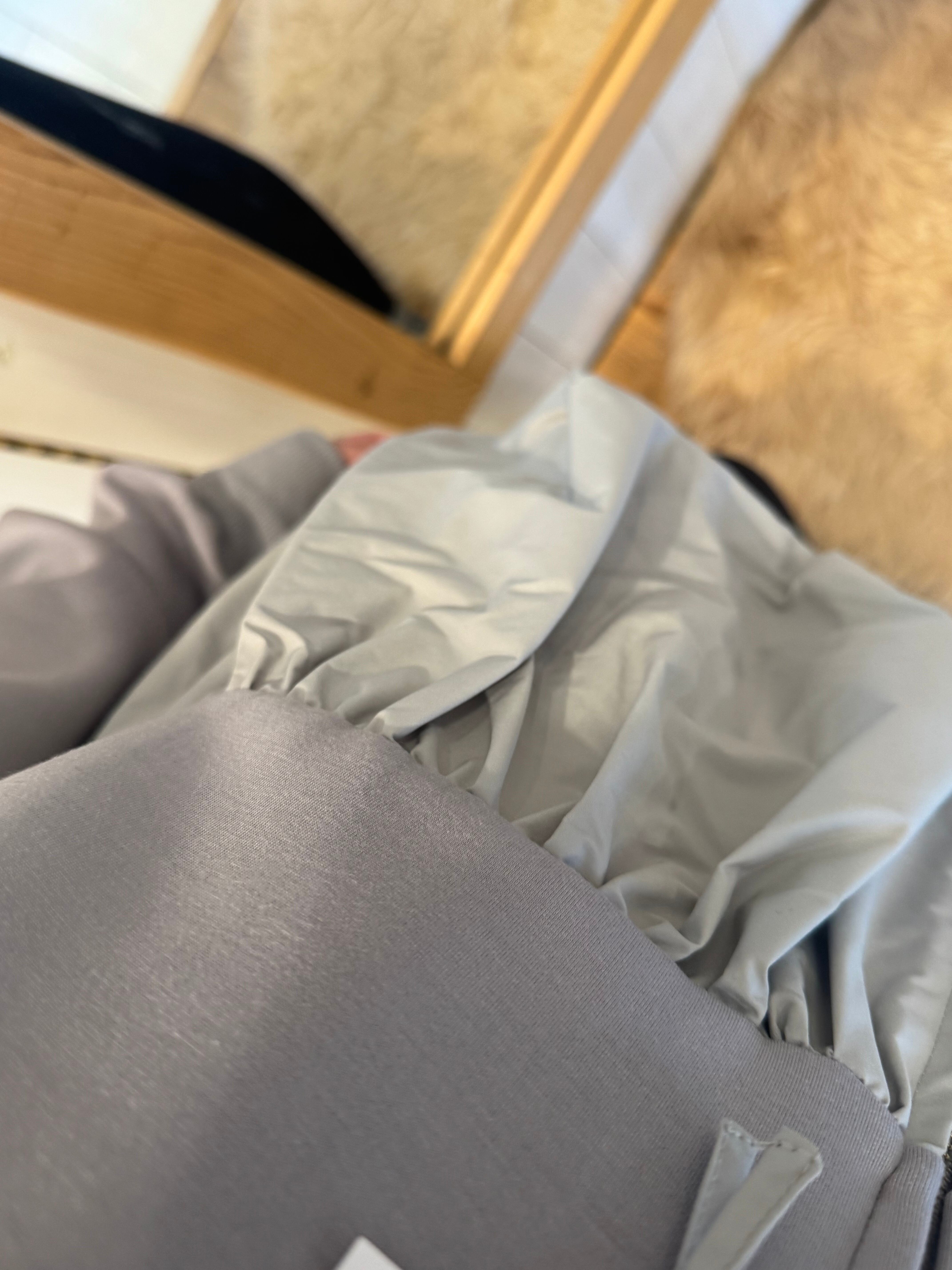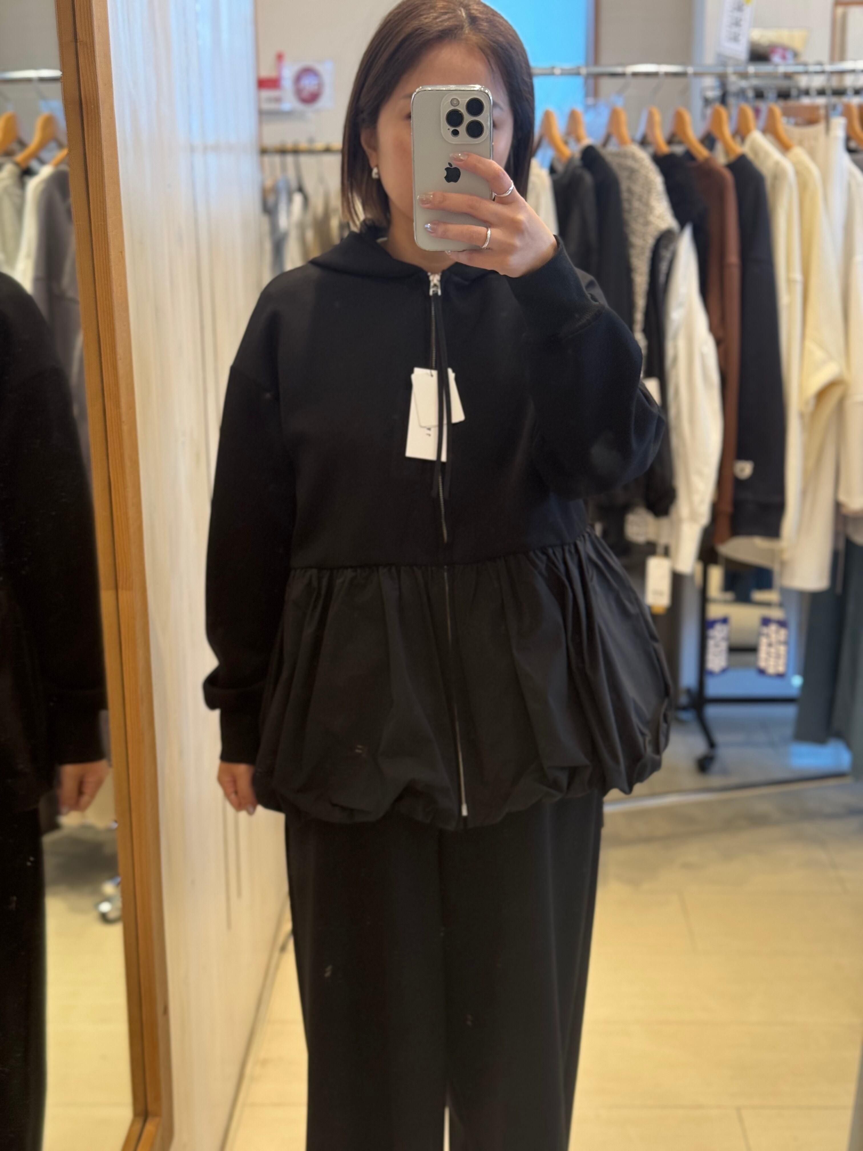 ダンボール素材とタフタがドッキングされたジップアップフーディ。