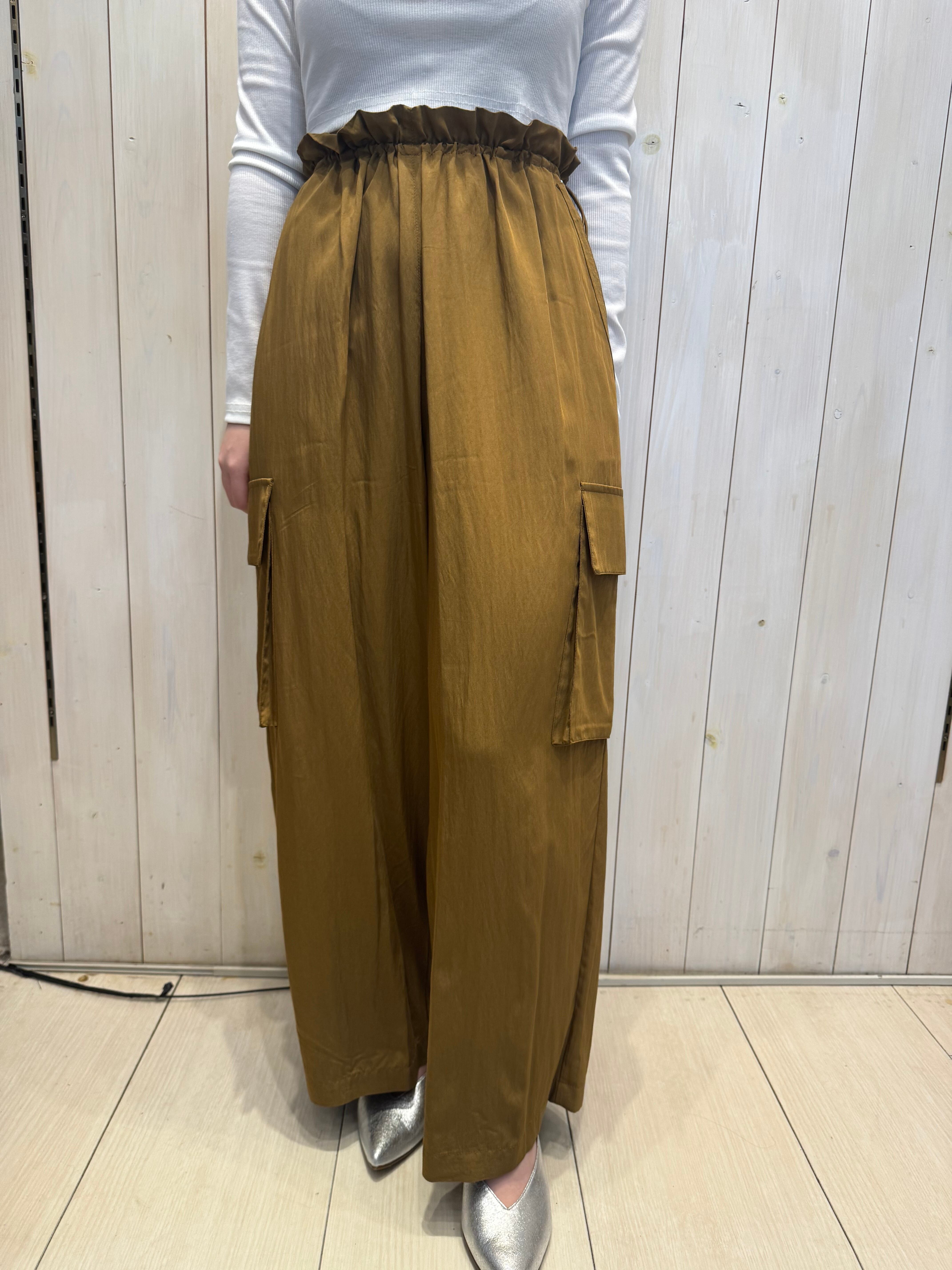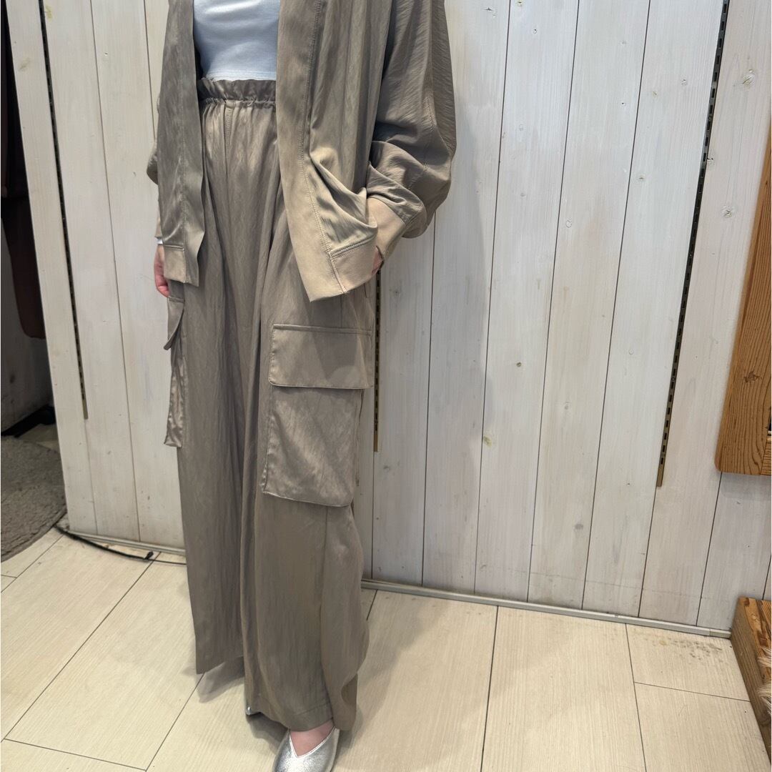 ワイドシルエット、大きめのポケットなどカジュアルなデザインながら、女性らしい素材感できれいめコーデとの相性◎